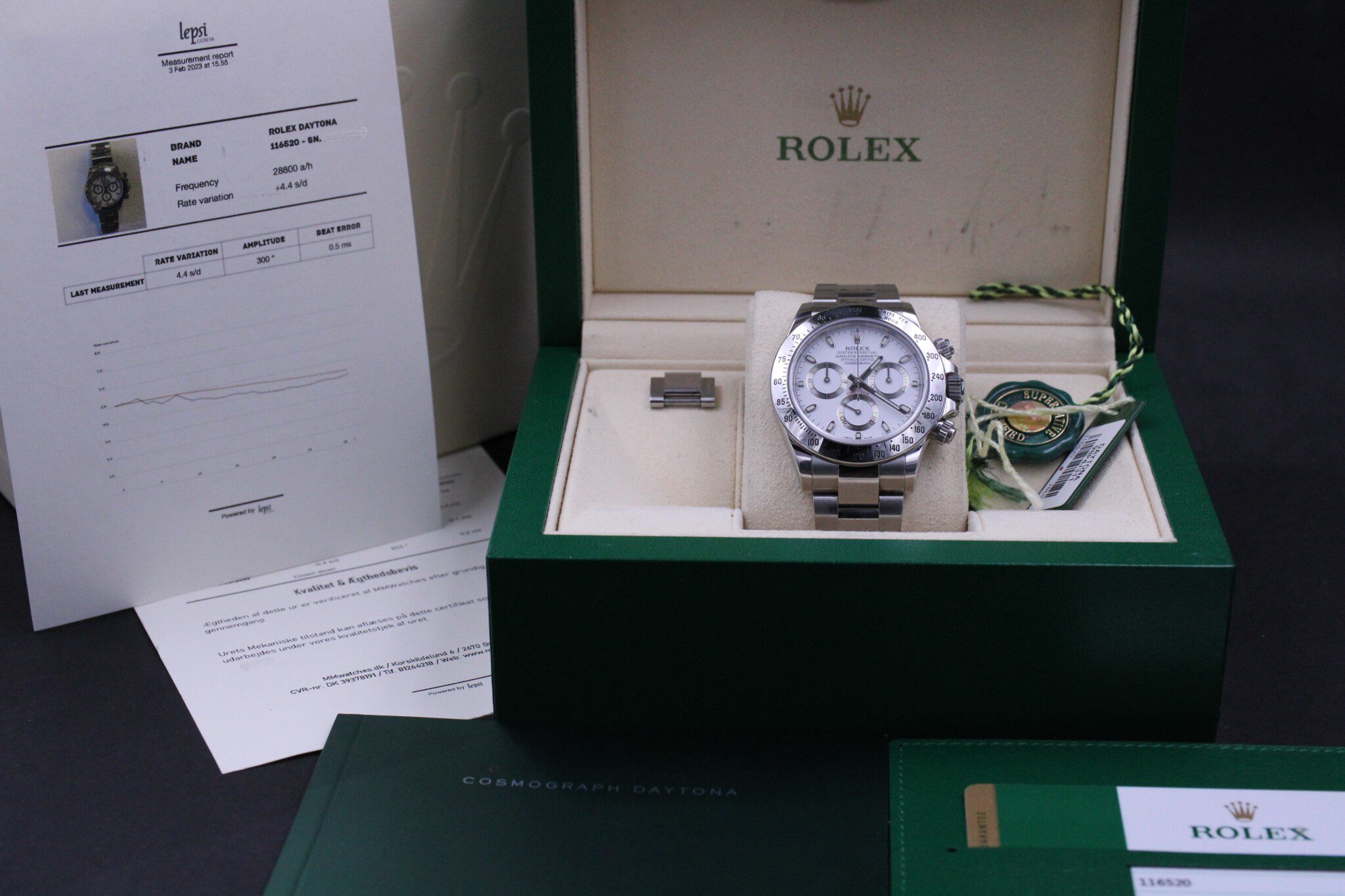 Med til dette ur medfølger MMwatches ”Kvalitet og ægthedsbevis”. Gennem vores grundige gennemgang af uret, fastslår vi at uret er 100% originalt. Urets mekaniske tilstand er testet og lever op til vores kvalitetskrav. Målingerne kan ses i det medfølgende bevis.