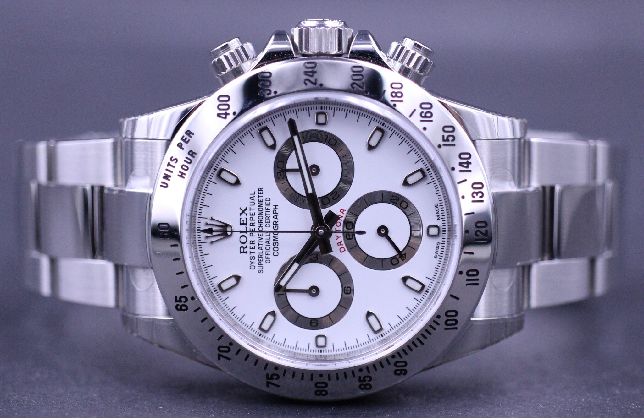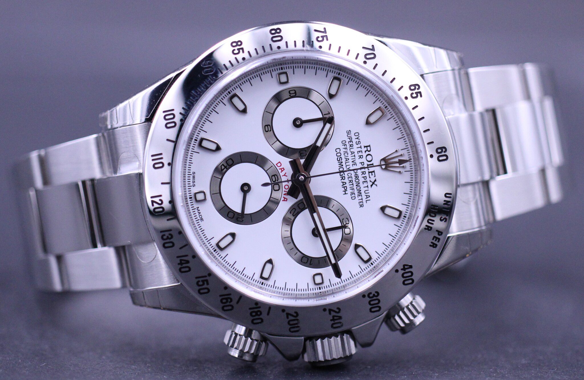 Et af de mest efterspurgte modeller fra Rolex, her det nu udgåede Rolex Daytona med hvid skive