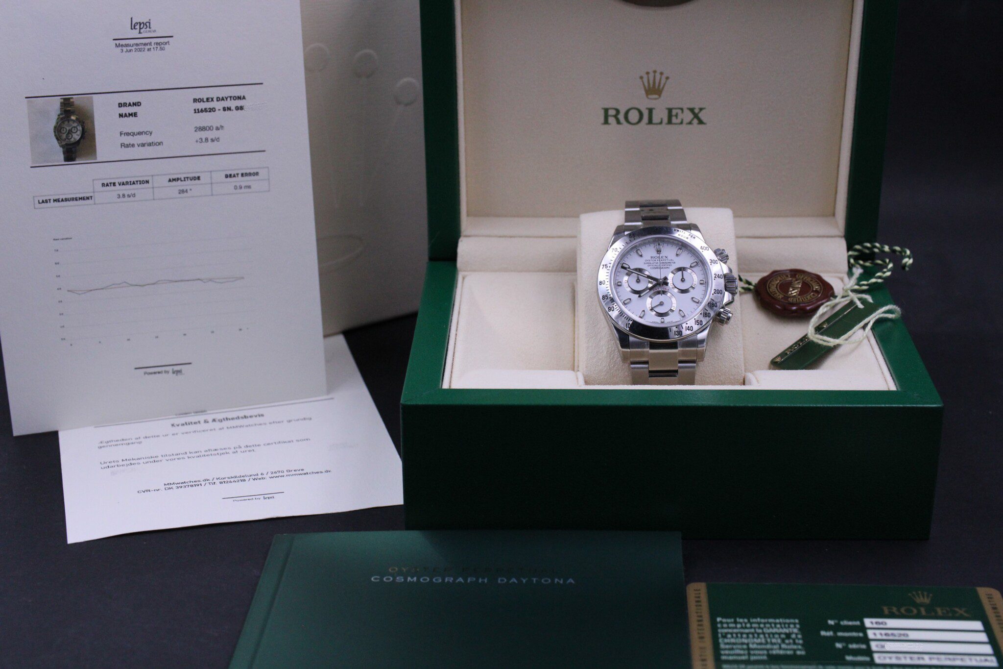 Med til dette ur medfølger MMwatches ”Kvalitet og ægthedsbevis”. Gennem vores grundige gennemgang af uret, fastslår vi at uret er 100% originalt. Urets mekaniske tilstand er testet og lever op til vores kvalitetskrav. Målingerne kan ses i det medfølgende bevis.