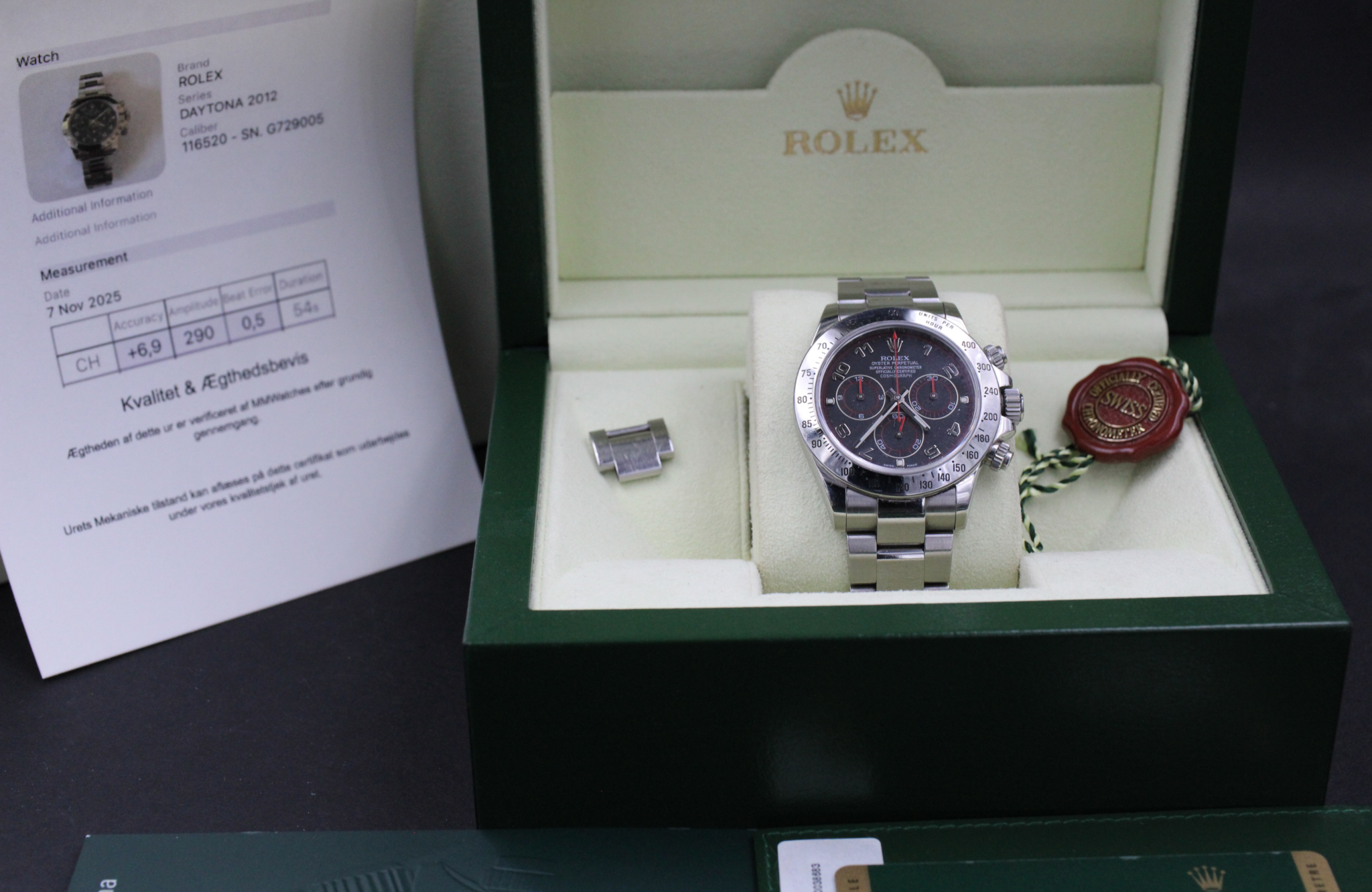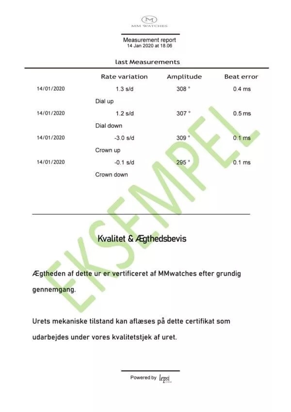 Med til dette ur medfølger MMwatches ”Kvalitet og ægthedsbevis”. Gennem vores grundige gennemgang af uret, fastslår vi at uret er 100% originalt. Urets mekaniske tilstand er testet og lever op til vores kvalitetskrav. Målingerne kan ses i det medfølgende bevis.