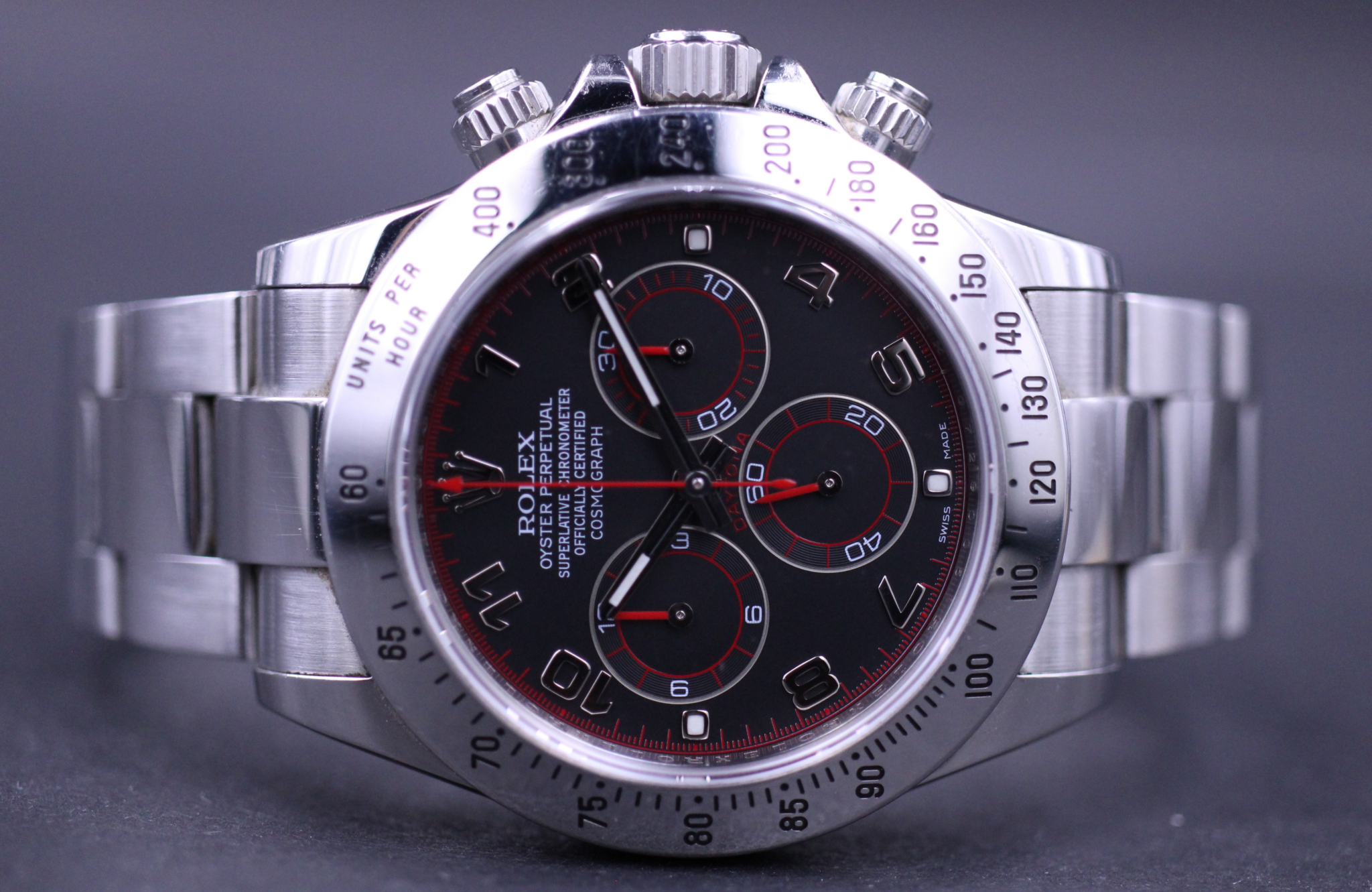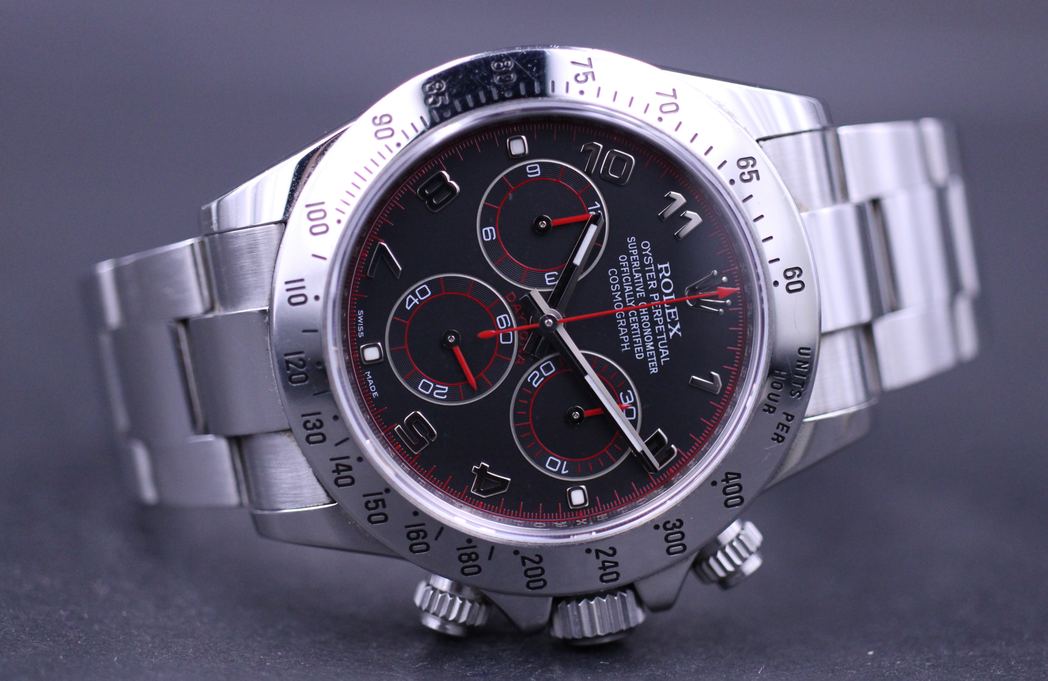 Et af de mest efterspurgte modeller fra Rolex, her det nu udgåede Rolex Daytona, her med sort Racing-skive monteret.