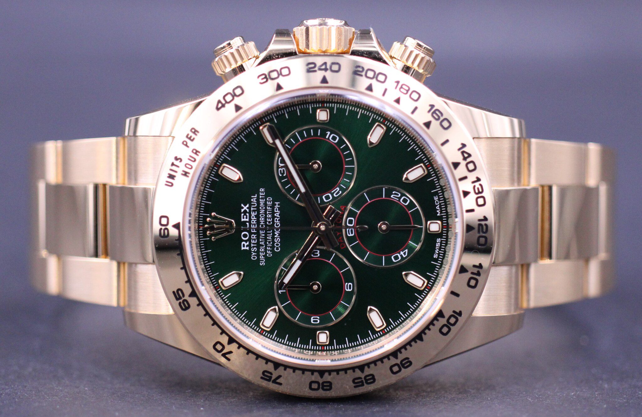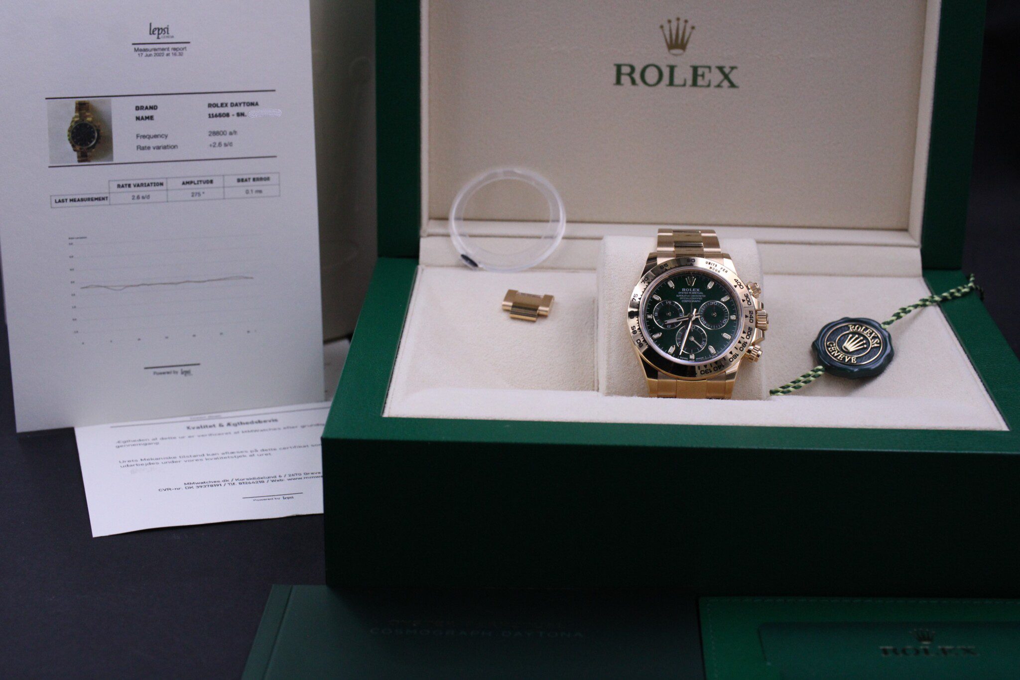 Super flot Rolex Daytona i 18k guld med den eftertragtede grønne skive.
