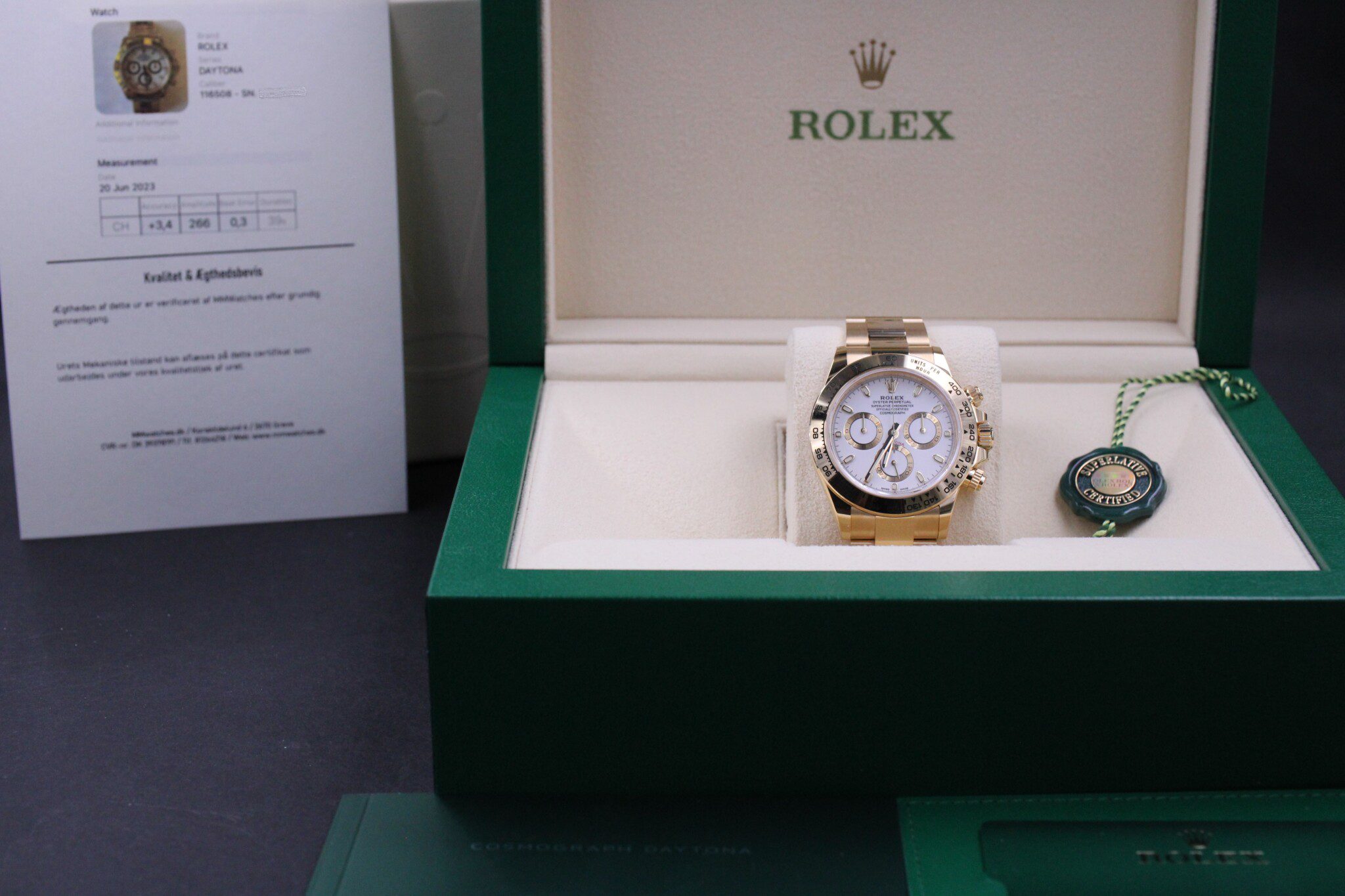 Rolex Daytona 18K guld, ref. 116508, her fra sommeren 2023 og dermed omfattet af Rolex World Wide Garanti til sommeren 2028. Uret er i fabriksny stand.