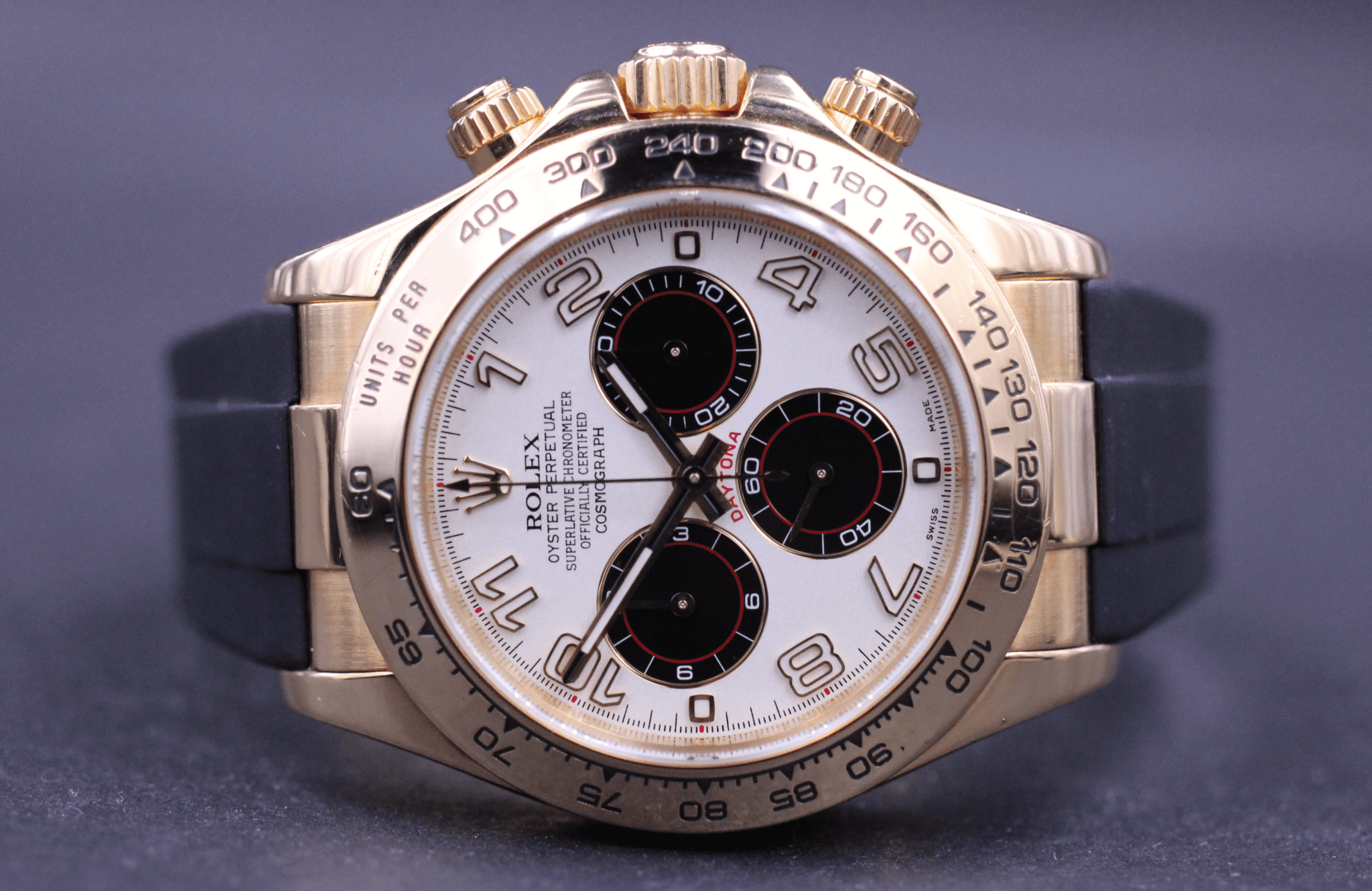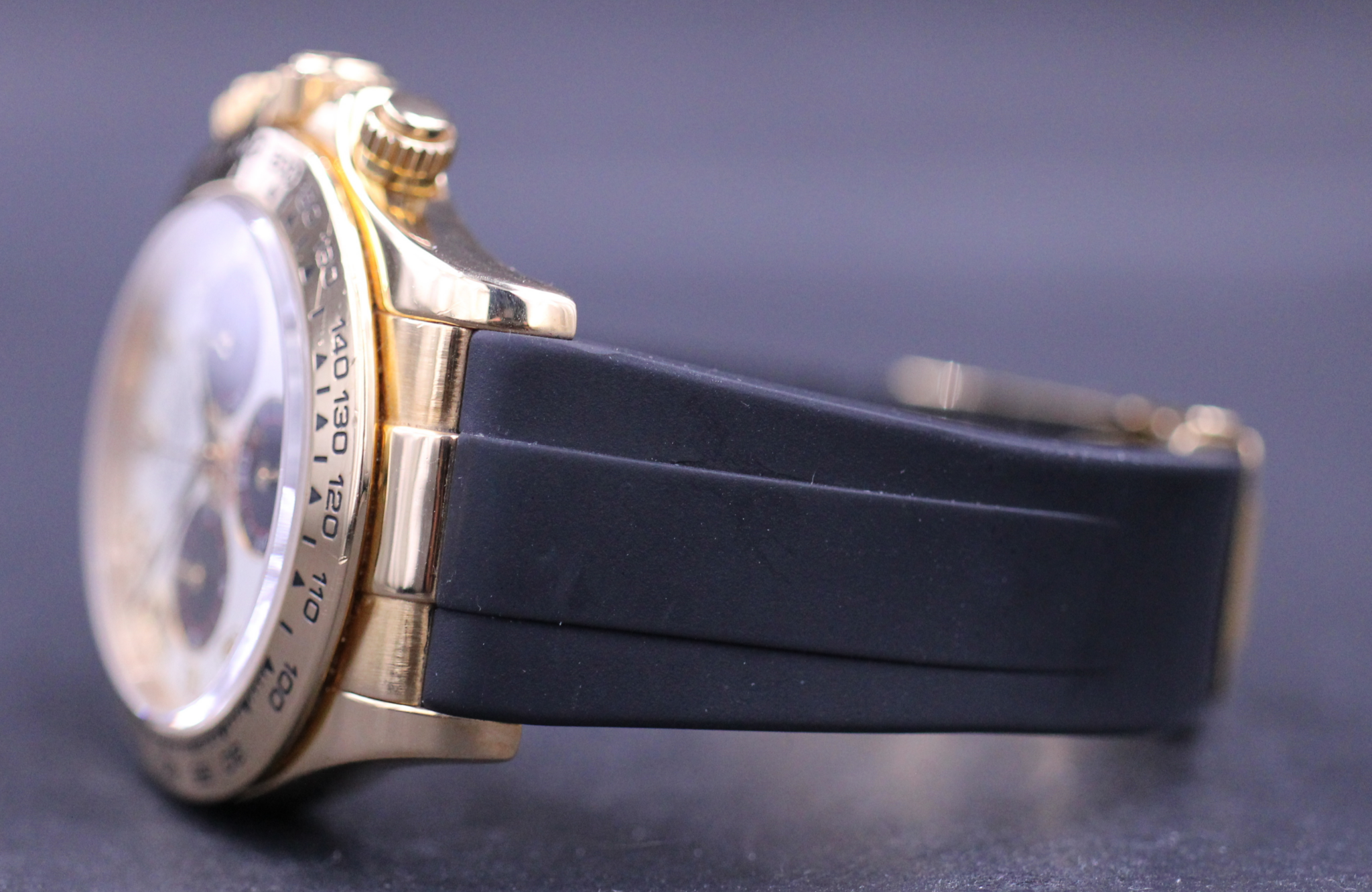 Super flot Rolex Daytona, monteret på sort Rubber-B rem. Kommer her i 18k guld, med hvid skive.