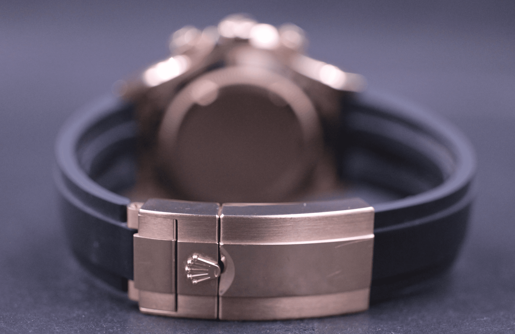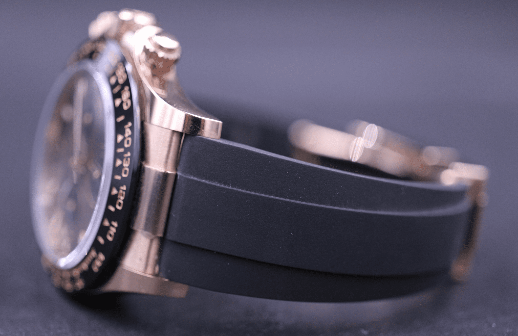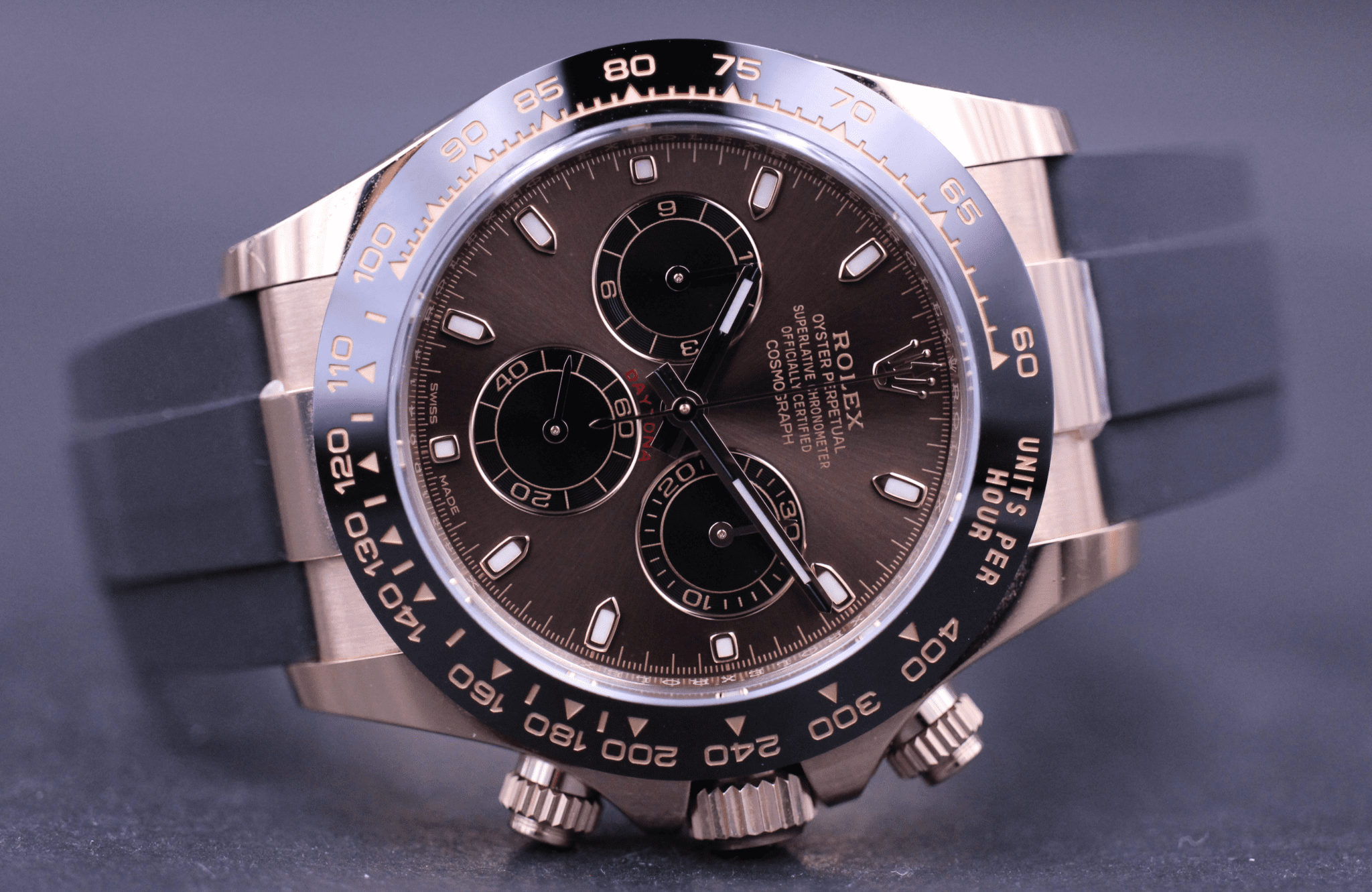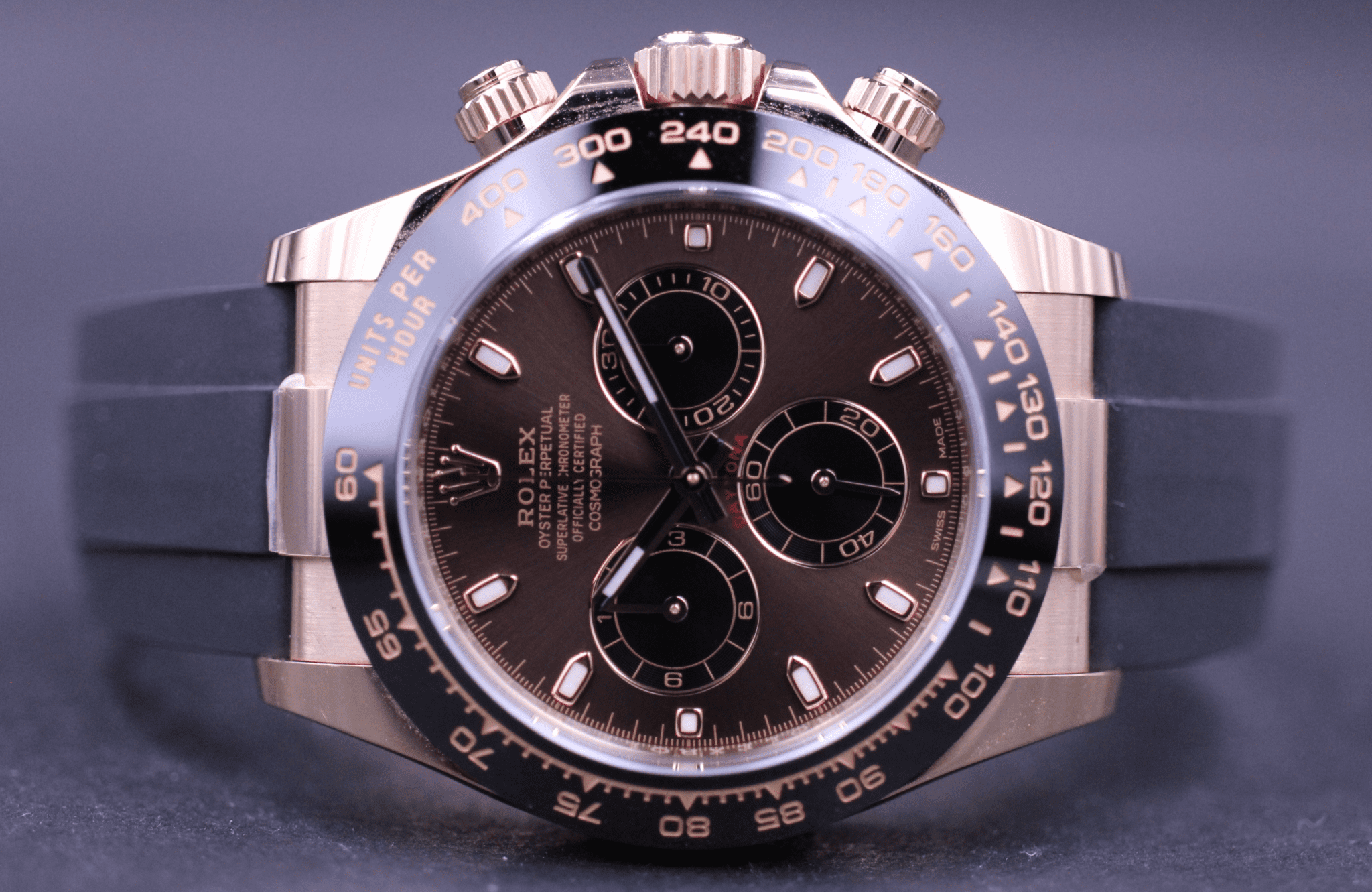 Super flot Rolex Daytona, på den nye oysterflex gummirem. Kommer her i 18k Rosegold, med den flotte Choko dial og sort keramisk lynette.