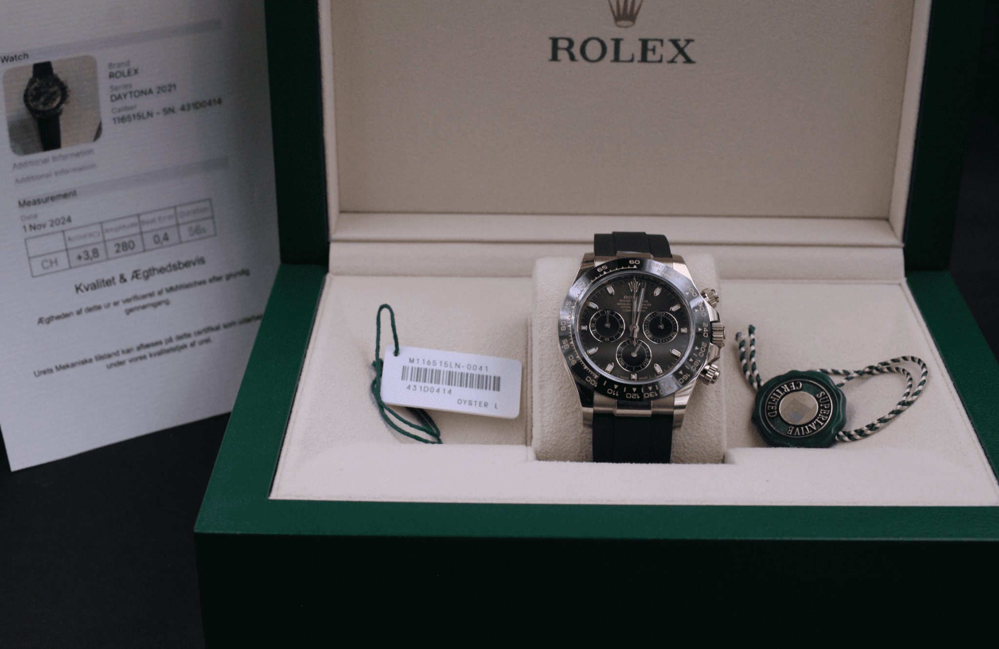 Mærke: Rolex Model: Daytona Ref. nr.: 116515LN Årgang: 2021 Tilbehør: Boks, papirer & certifikat Funktioner: Chronograf, Tachymeter Størrelse: 40mm Stand: 95%