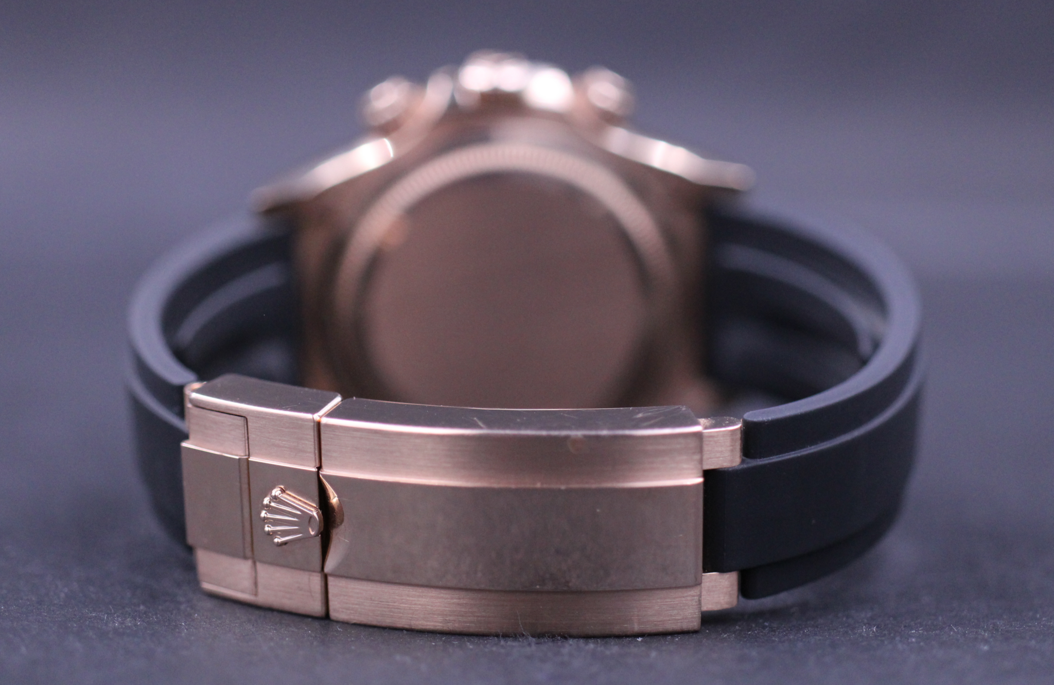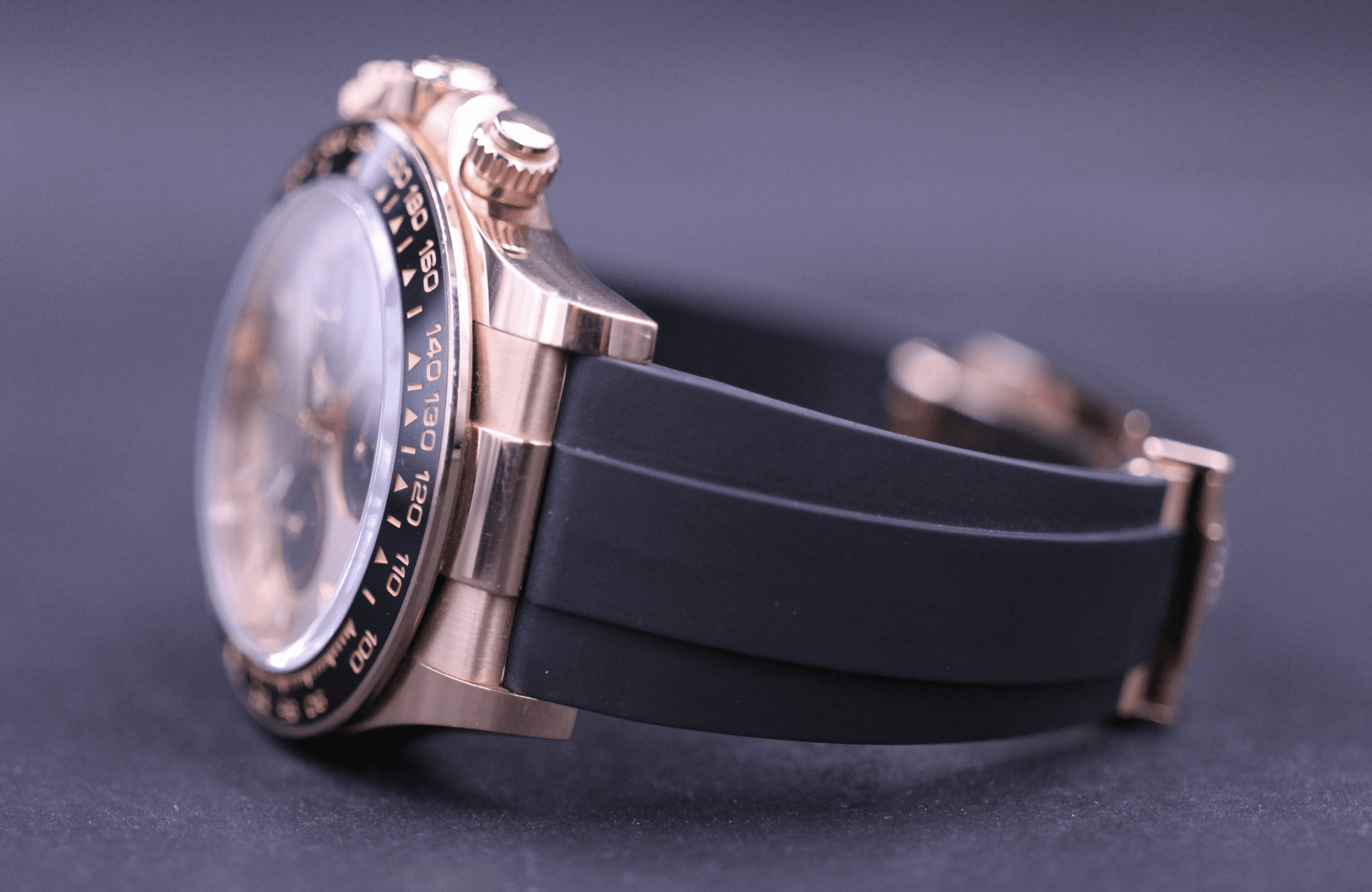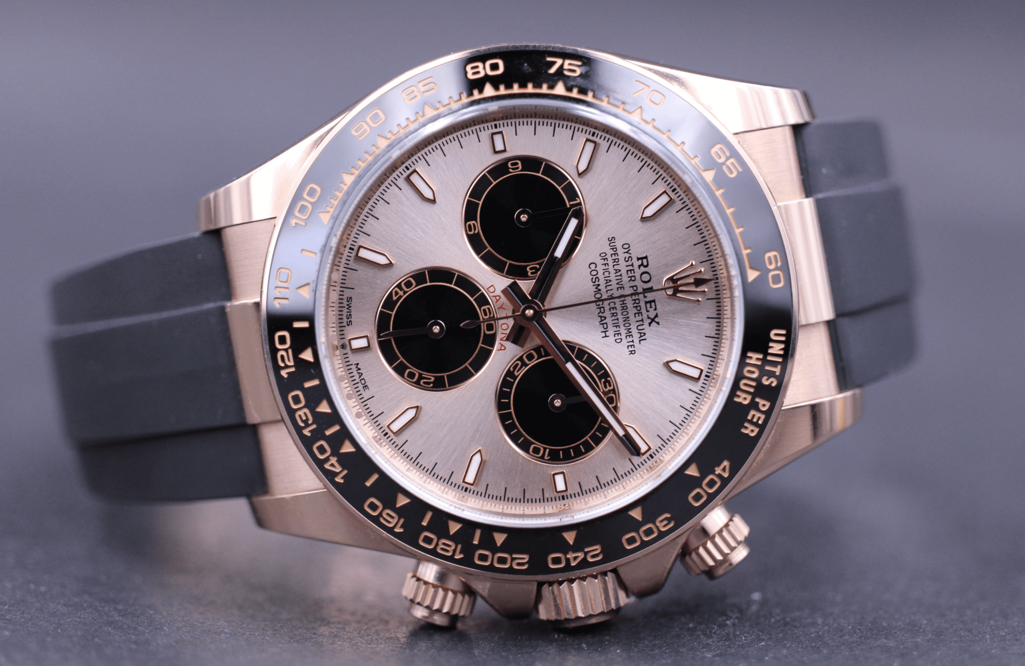 Det nye Rolex Daytona, monteret på Oysterflex rem. Kommer her i 18k rosegold, med en flot champagne-farvet skive og sort keramisk lynette.