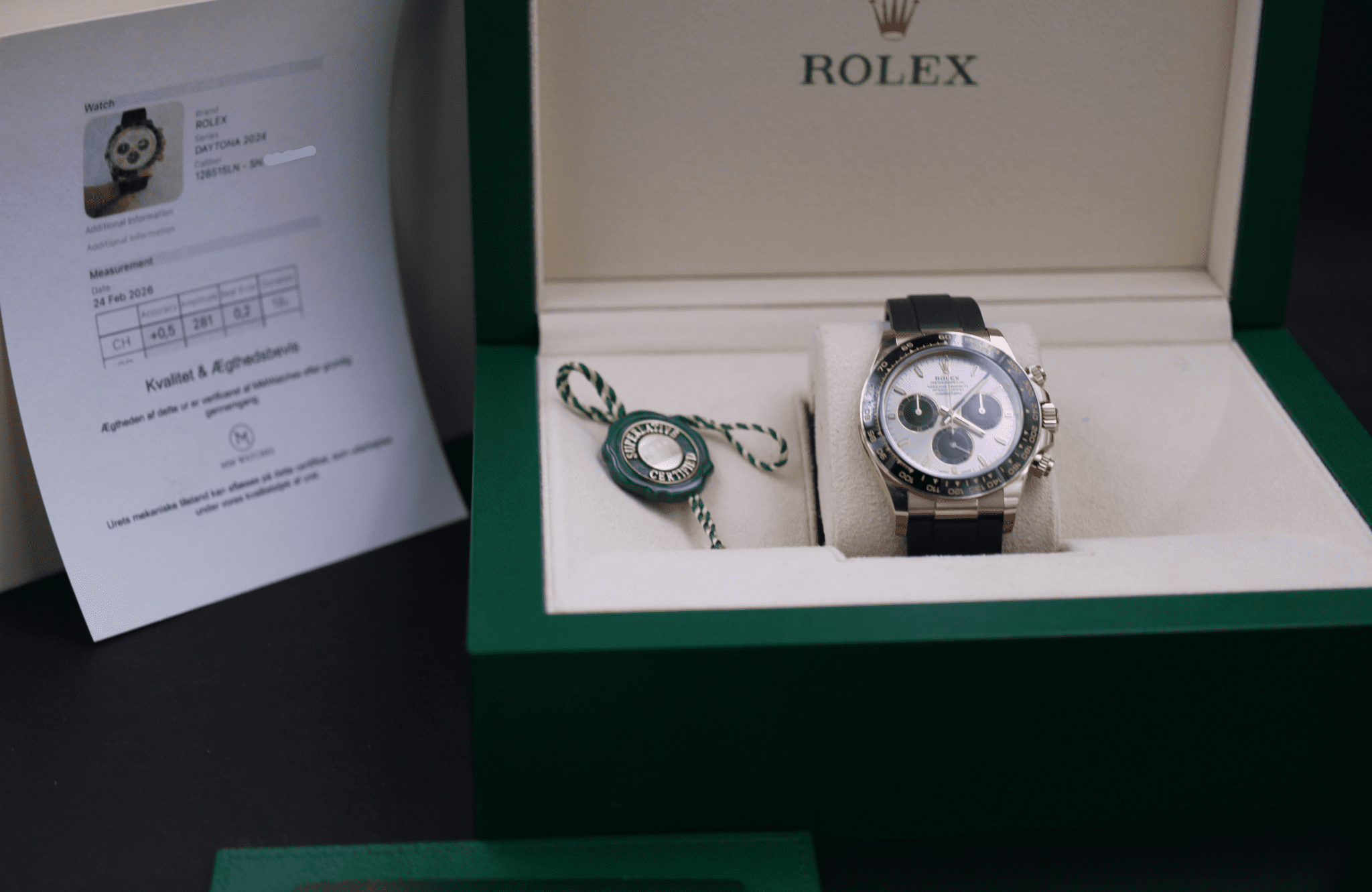 Med til dette ur medfølger MMwatches ”Kvalitet og ægthedsbevis”. Gennem vores grundige gennemgang af uret, fastslår vi at uret er 100% originalt. Urets mekaniske tilstand er testet og lever op til vores kvalitetskrav. Målingerne kan ses i det medfølgende bevis.