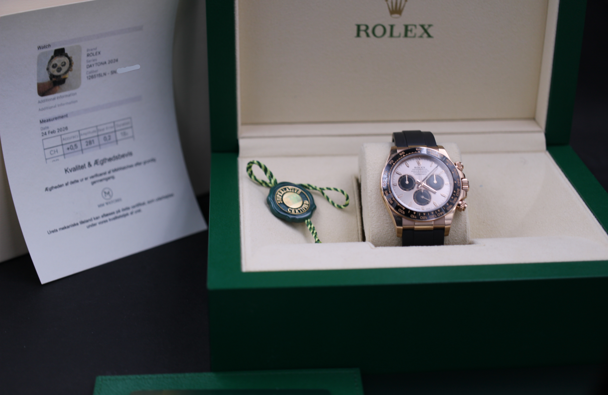 Rolex Daytona 18K roseguld, ref. 126515LN fra 2024 og omfattet af Rolex World Wide Garanti til 2029. Uret er i perfekt stand.