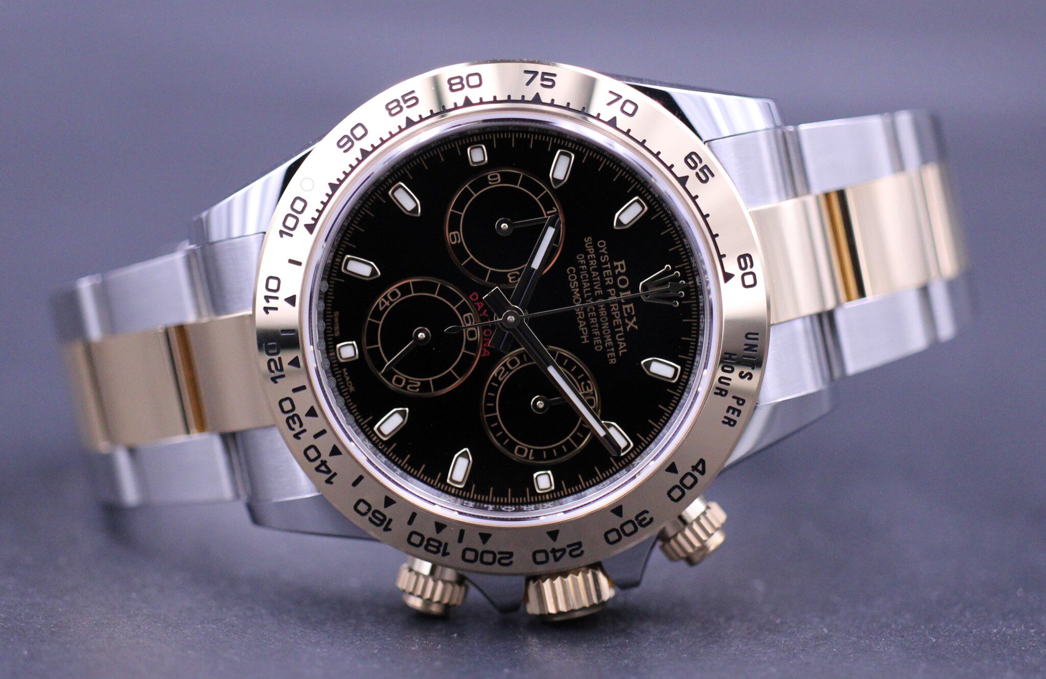 Guld/stål version af Rolex klassikeren Daytona, her med sort skive. Daytona er nok den mest kendte kronograf i verden og et ikon iblandt Rolex samlere. Uret er med et automatisk 4130 værk og blå parachrom hairspring og naturligvis kronograf funktion.