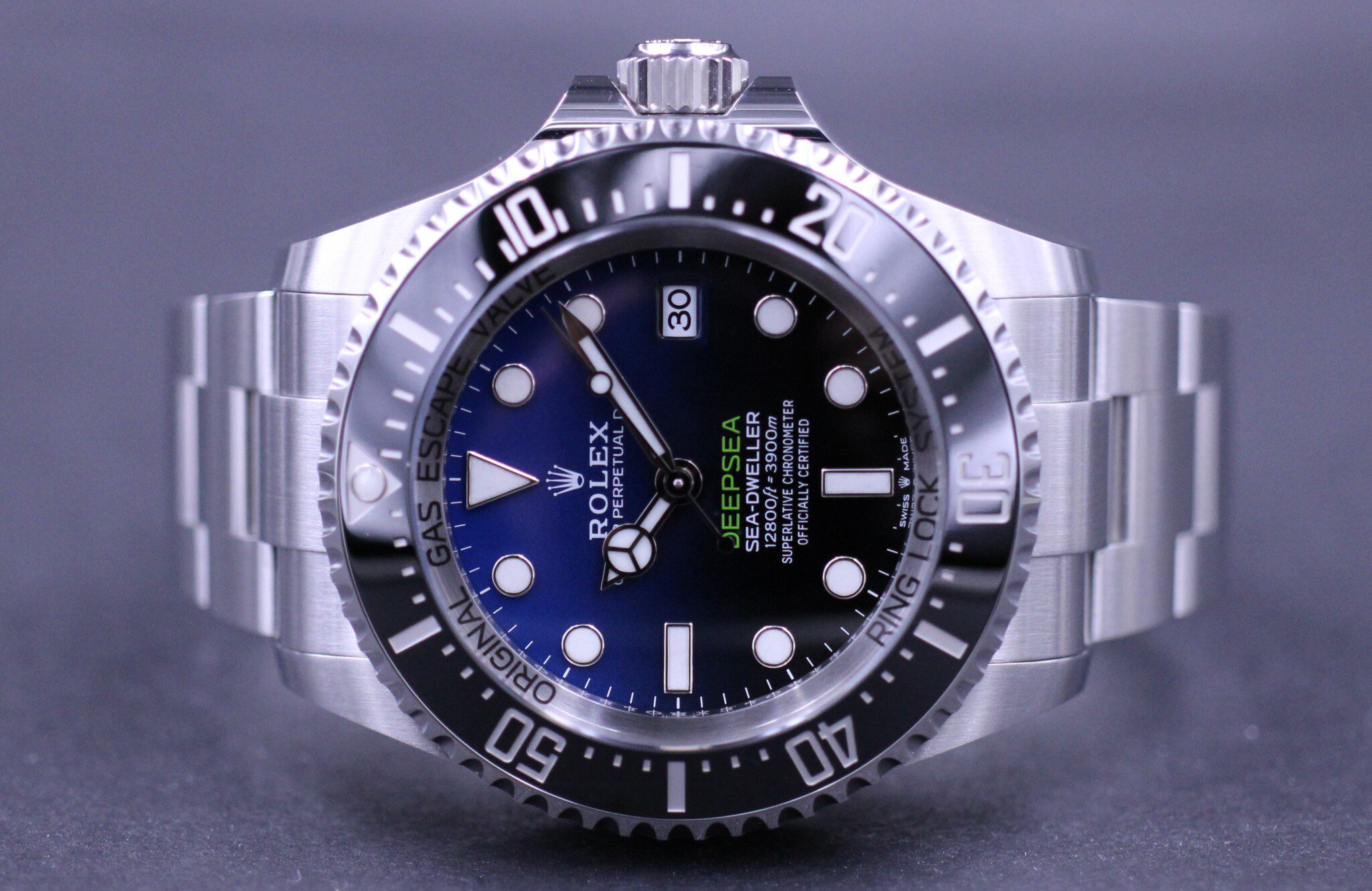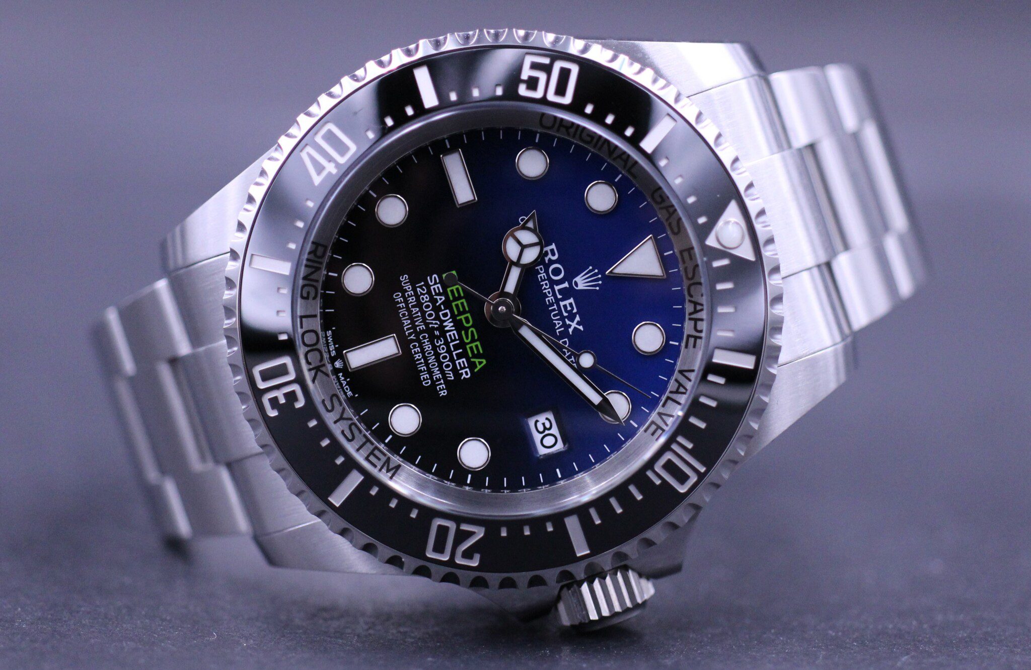 Den nyeste udgave af Rolex Deepsea Sea-Dweller, her i versionen D-Blue, dermed sin blå og sorte skive giver et anerkendende nik til James Camerons solodyk til bunden af Mariana Trench.