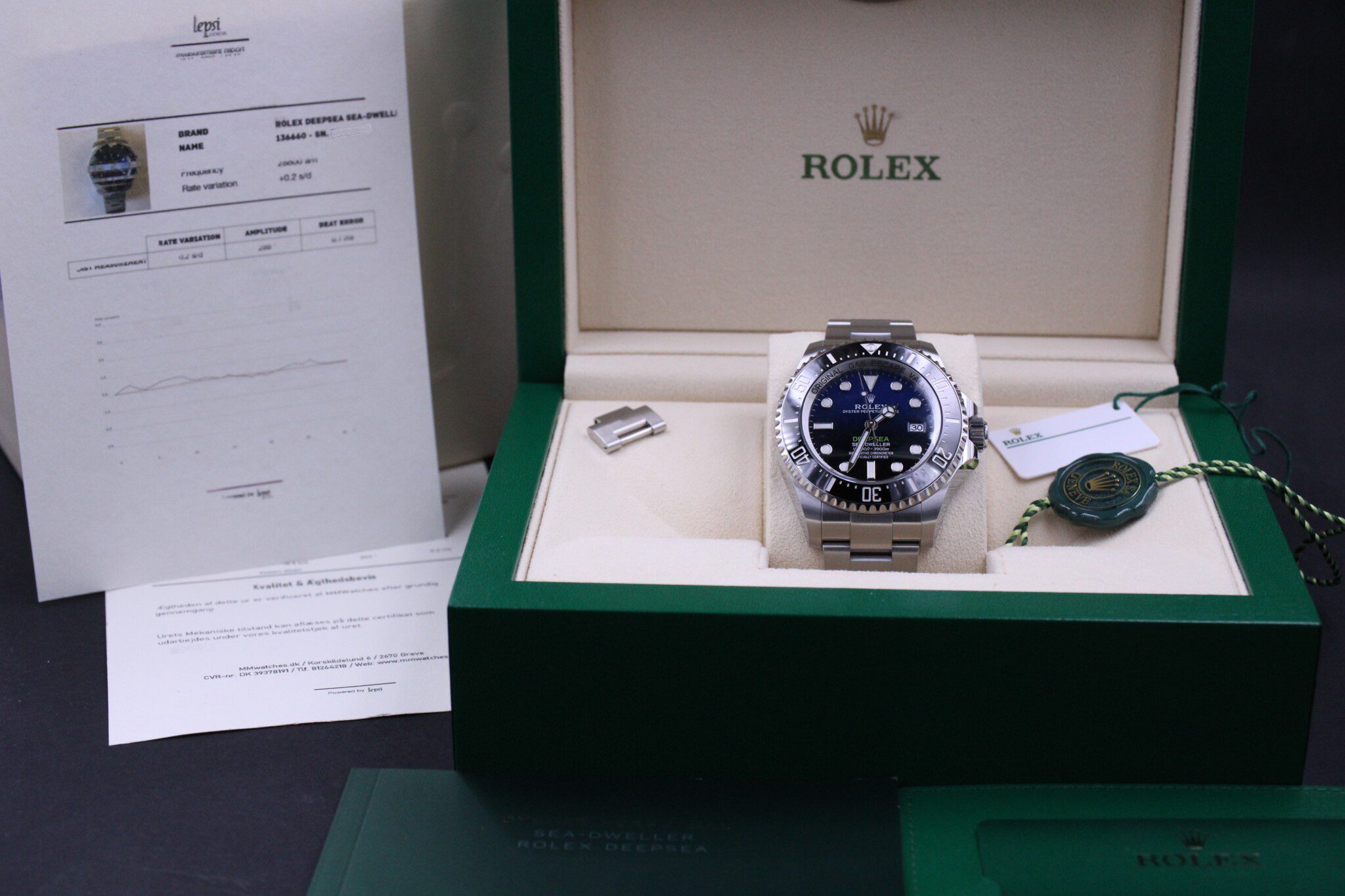 Mærke: Rolex Model: Deepsea Sea-Dweller Ref. nr.: 136660 Årgang: 2023 Tilbehør: Boks, papirer & certifikat Funktioner: Dato Størrelse: 44mm Stand: 100%