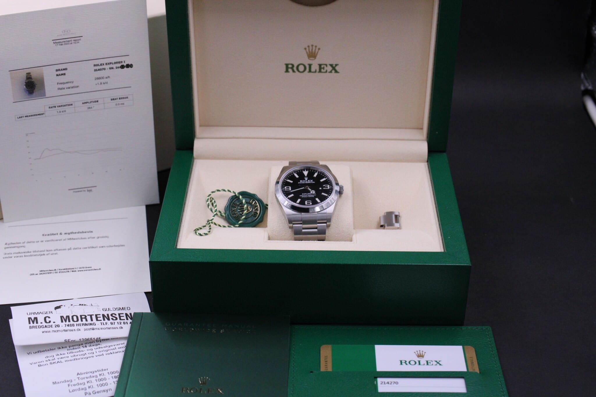 Rolex Explorer, ref 214270 solgt hos dansk AD i november 2019. Uret er 100% fabriksnyt. Omfattet af Rolex World Wide Garanti til 2024.