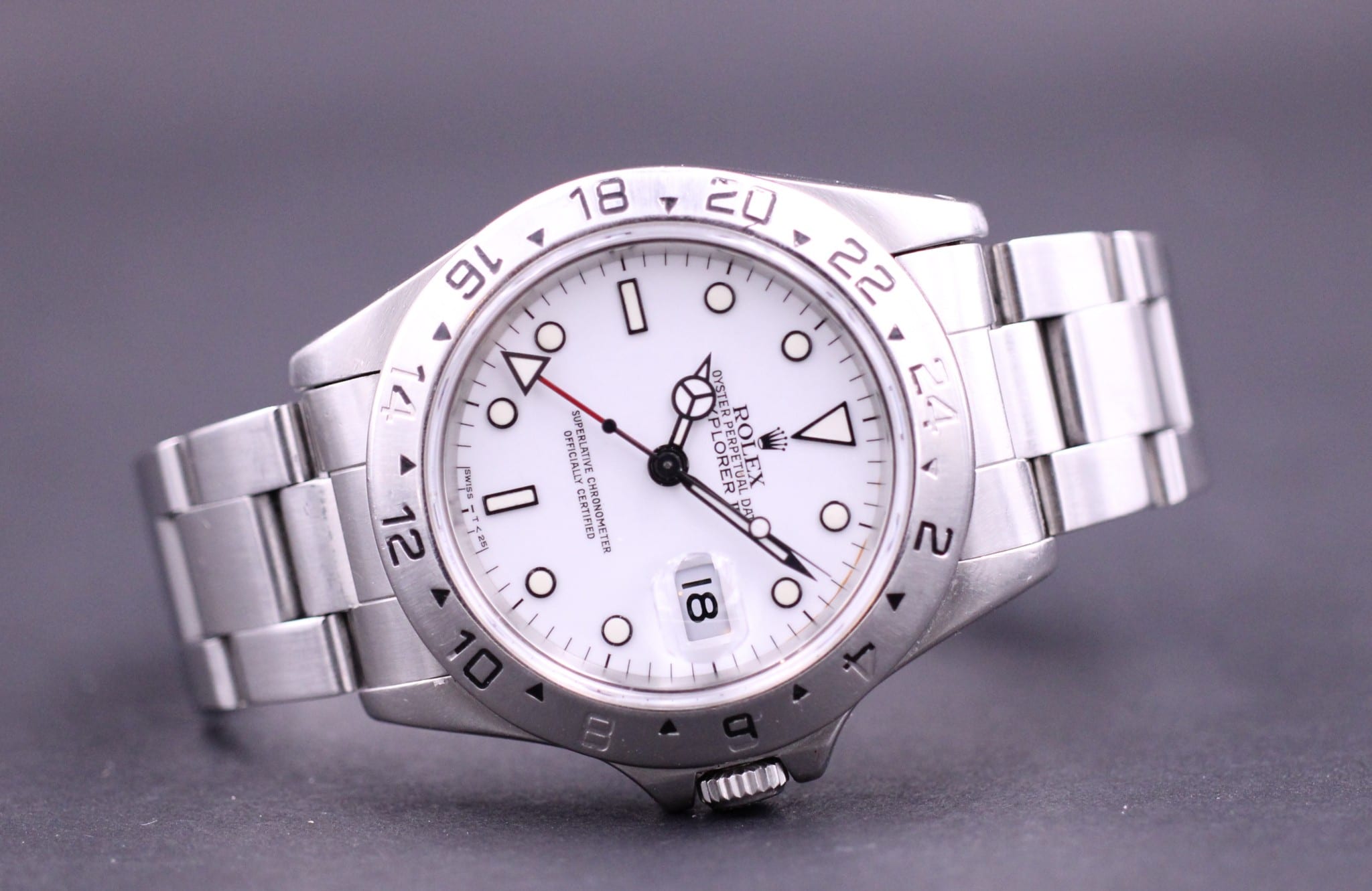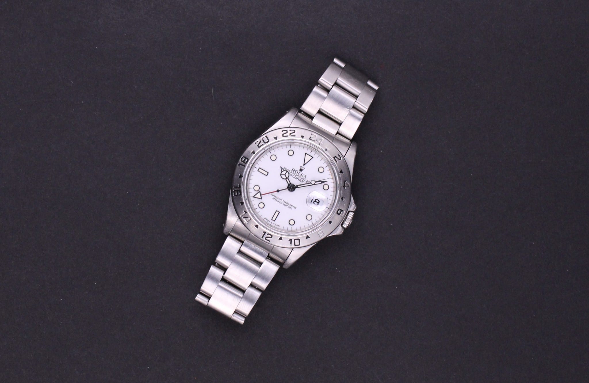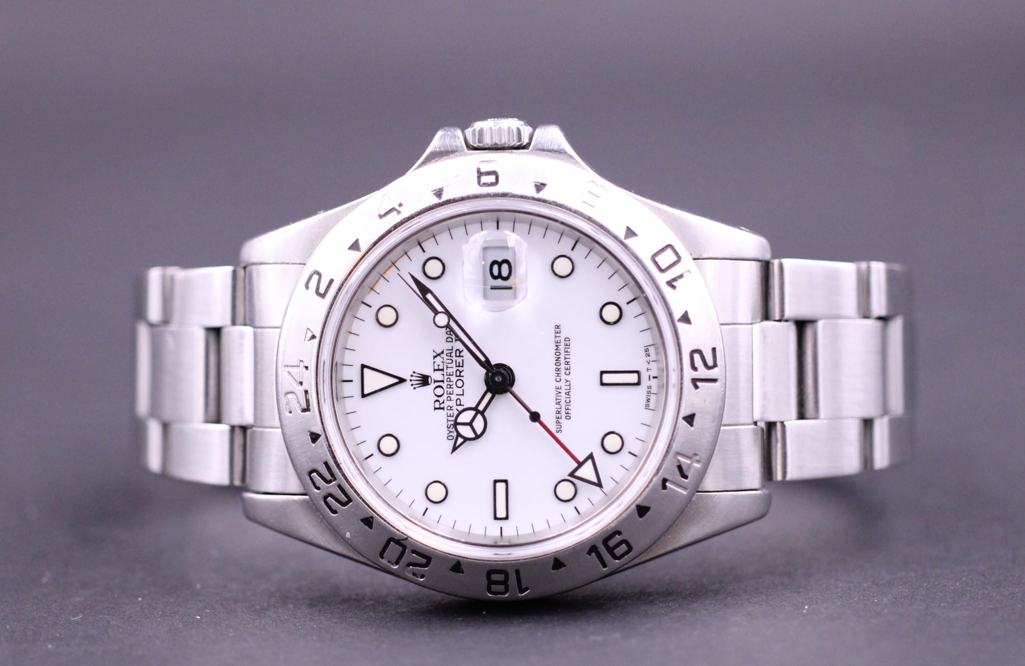 klassisk Rolex Explorer II, som nu er udgået og erstattet af den større model. Uret er med den hvide polar skive og røde GMT viser.