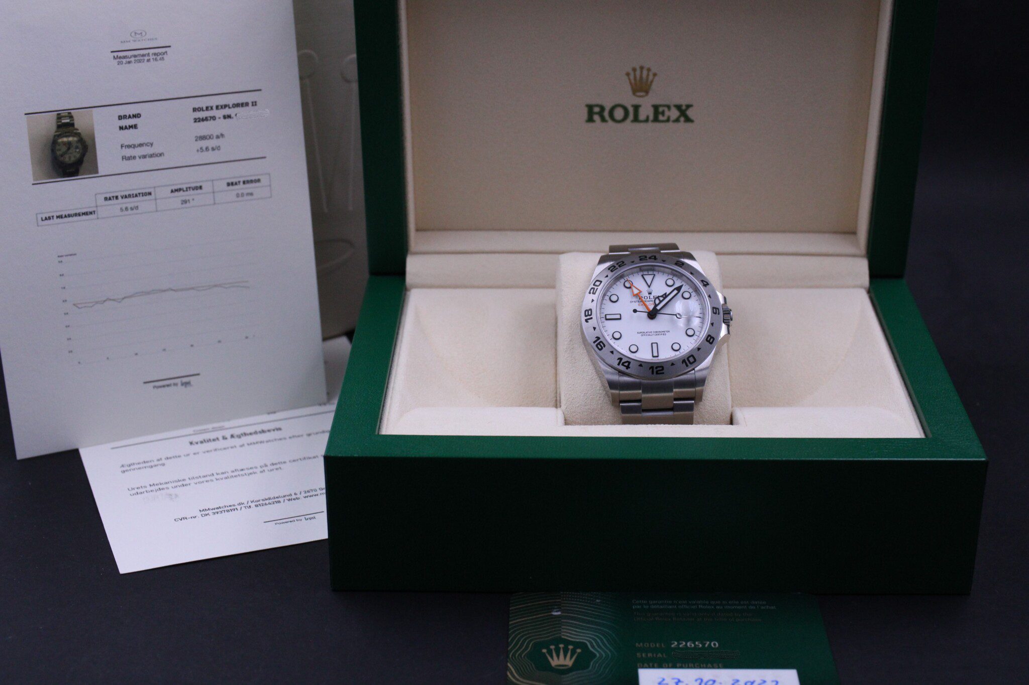 Rolex Explorer II, ref. 226570, her fra 2022. Uret er omfattet af Rolex World Wide Garanti til 2027. Uret er 100% fabriksnyt.