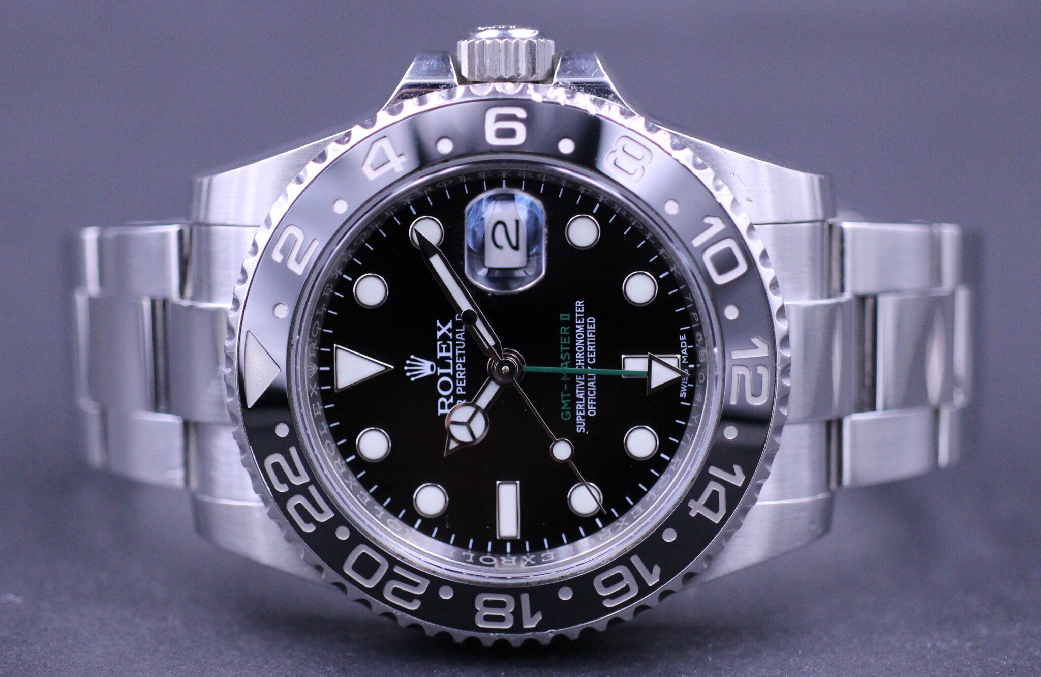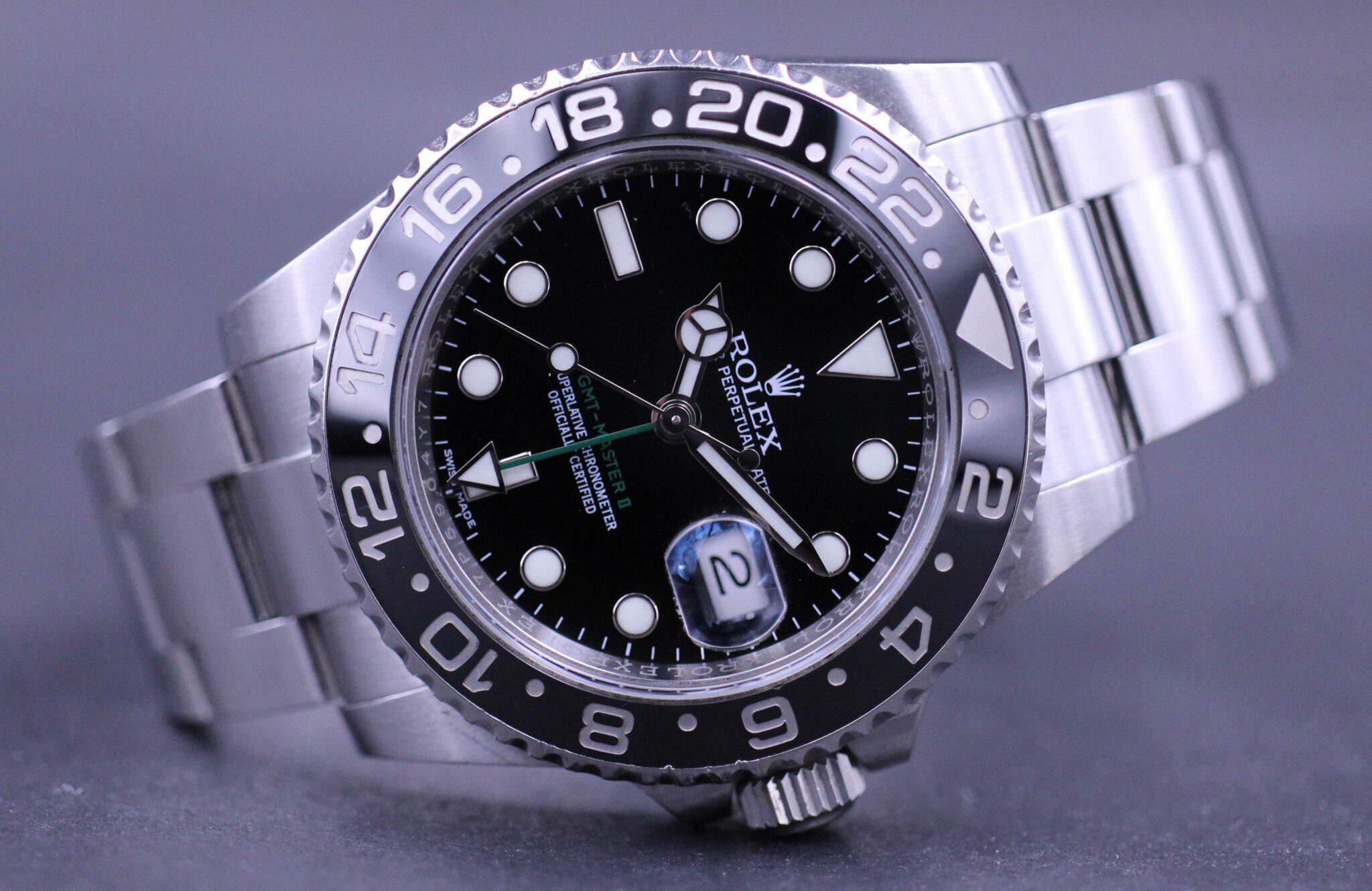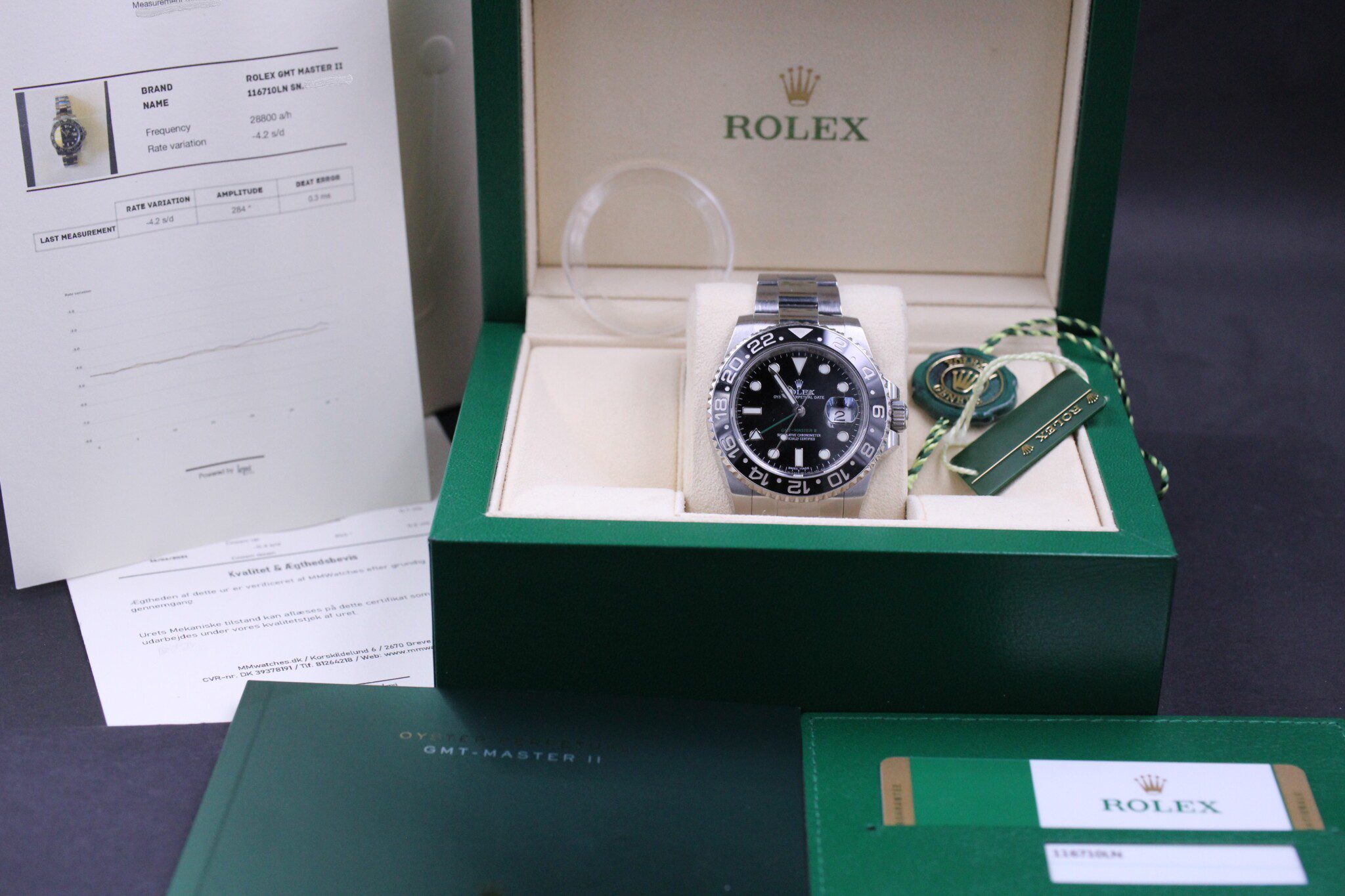 Mærke: Rolex Model: GMT-Master II Ref. nr.: 116710LN Årgang: 2016 Tilbehør: Boks, papirer & certifikat Funktioner: Dato & GMT Størrelse: 40mm Stand: 90%