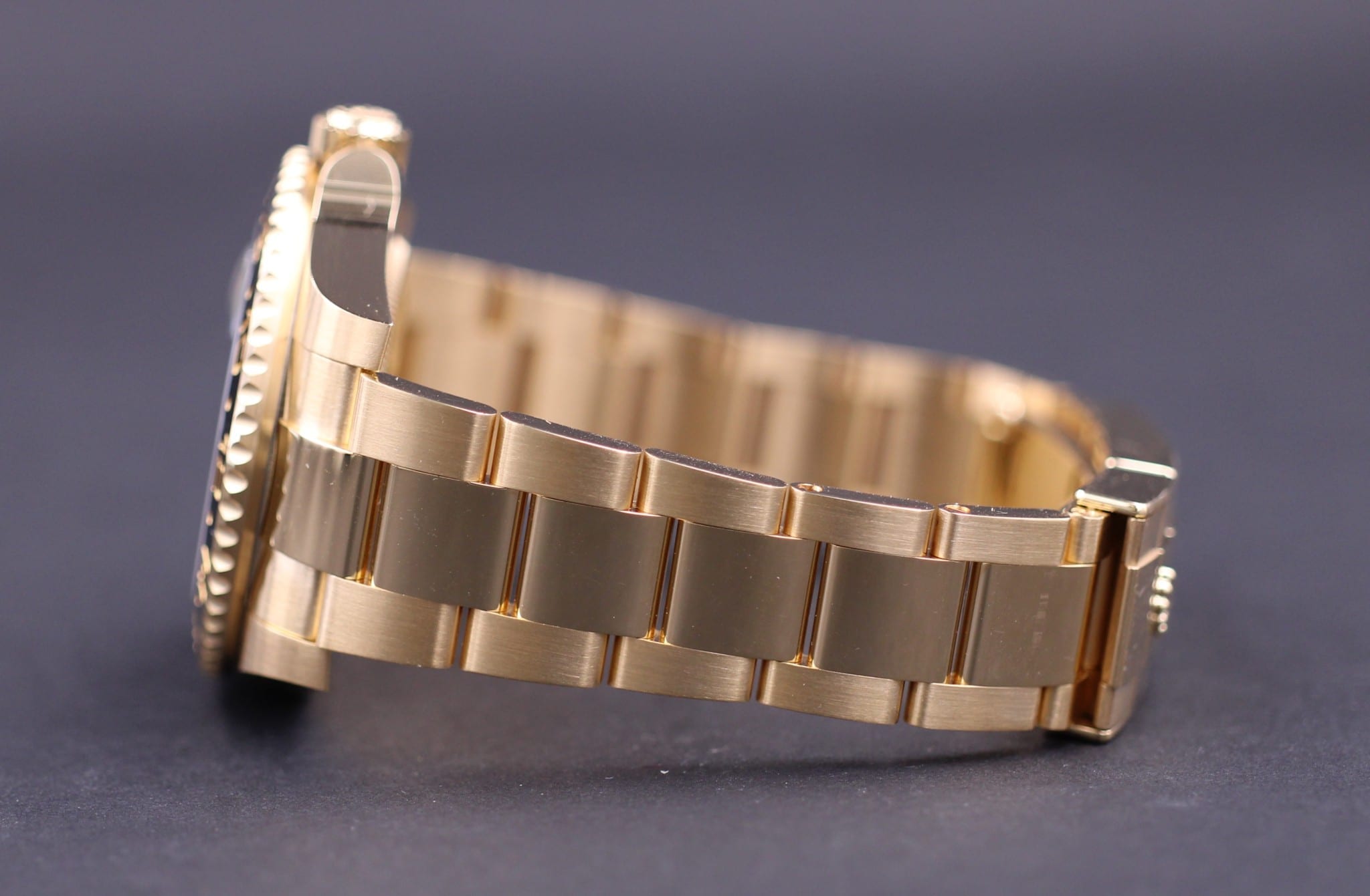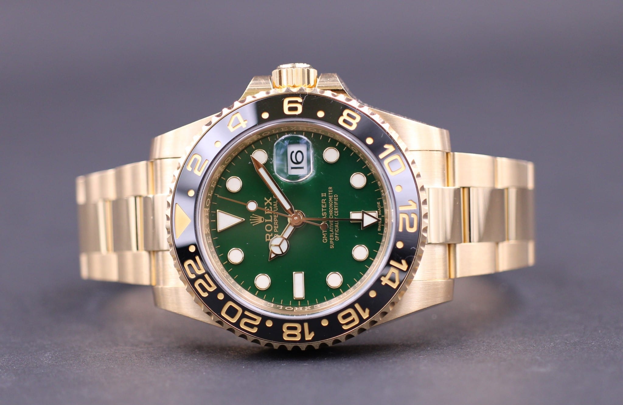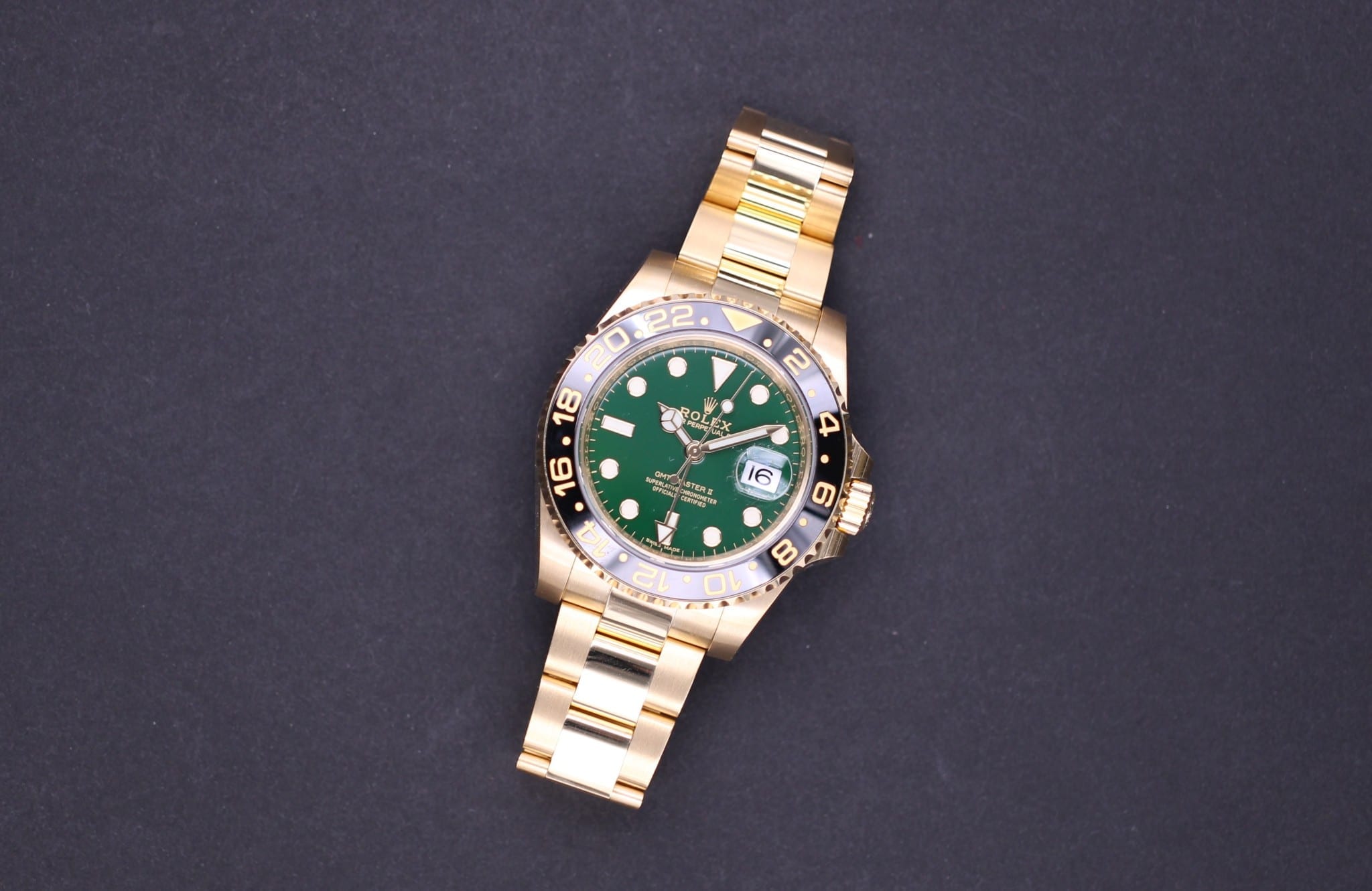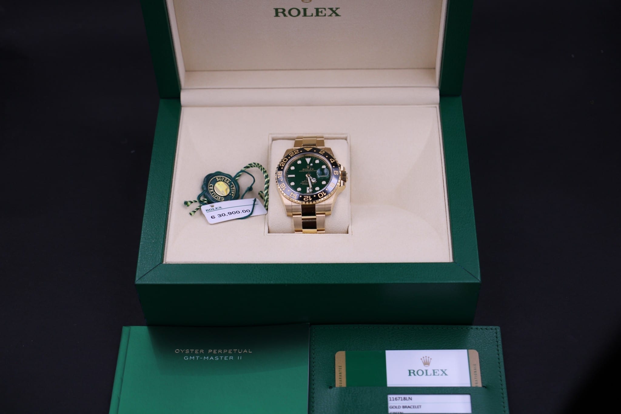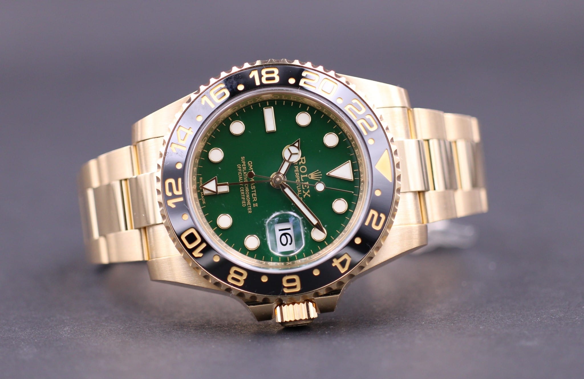 Super lækker GMT som er af den nyeste model med keramisk lynette og maxikasse. Uret er i 18kt. guld og med den populære grønne “money dial”