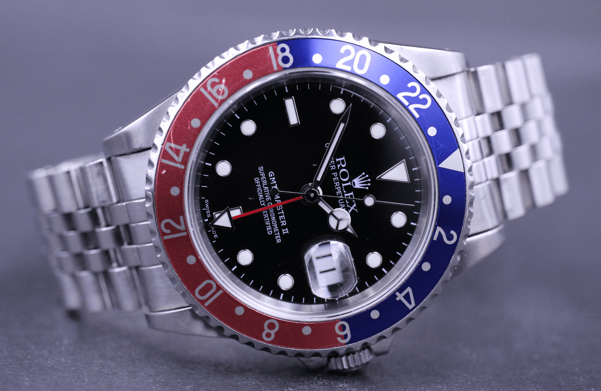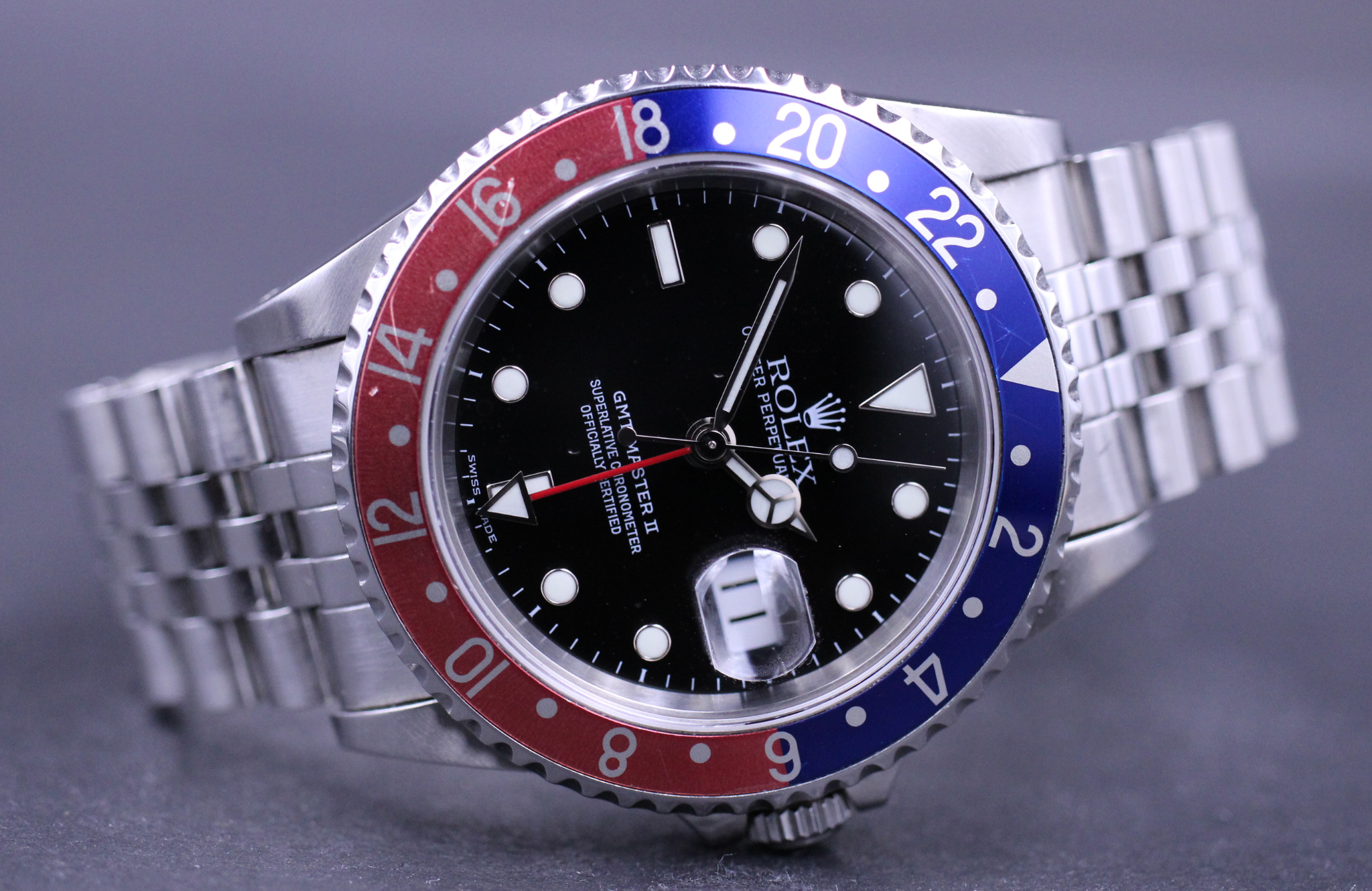 Rolex GMT-Master II, ref. 16710, Y-serie. Uret er i flot stand og klar til burg.