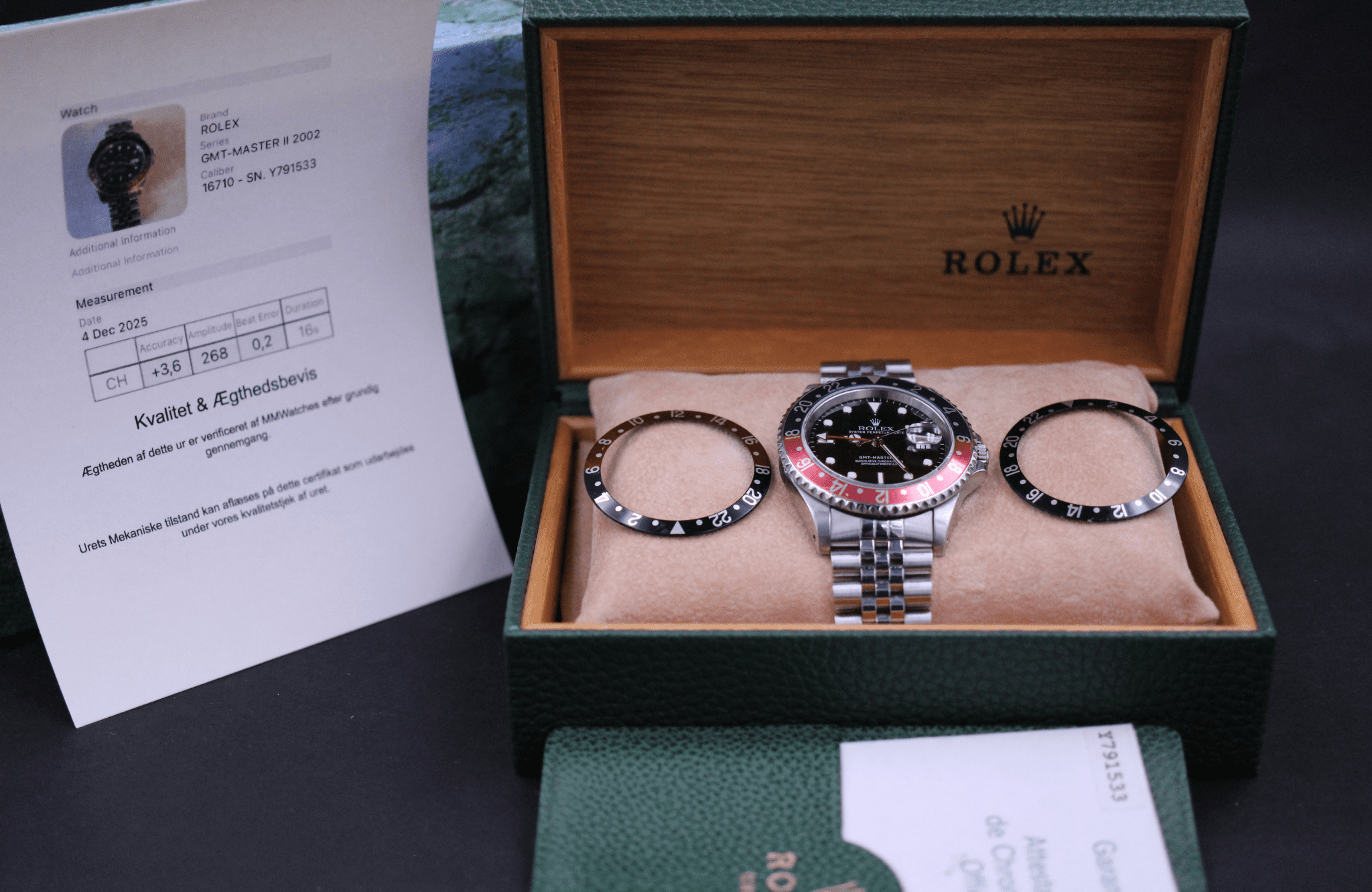 Med til dette ur medfølger MMwatches ”Kvalitet og ægthedsbevis”. Gennem vores grundige gennemgang af uret, fastslår vi at uret er 100% originalt. Urets mekaniske tilstand er testet og lever op til vores kvalitetskrav. Målingerne kan ses i det medfølgende bevis.