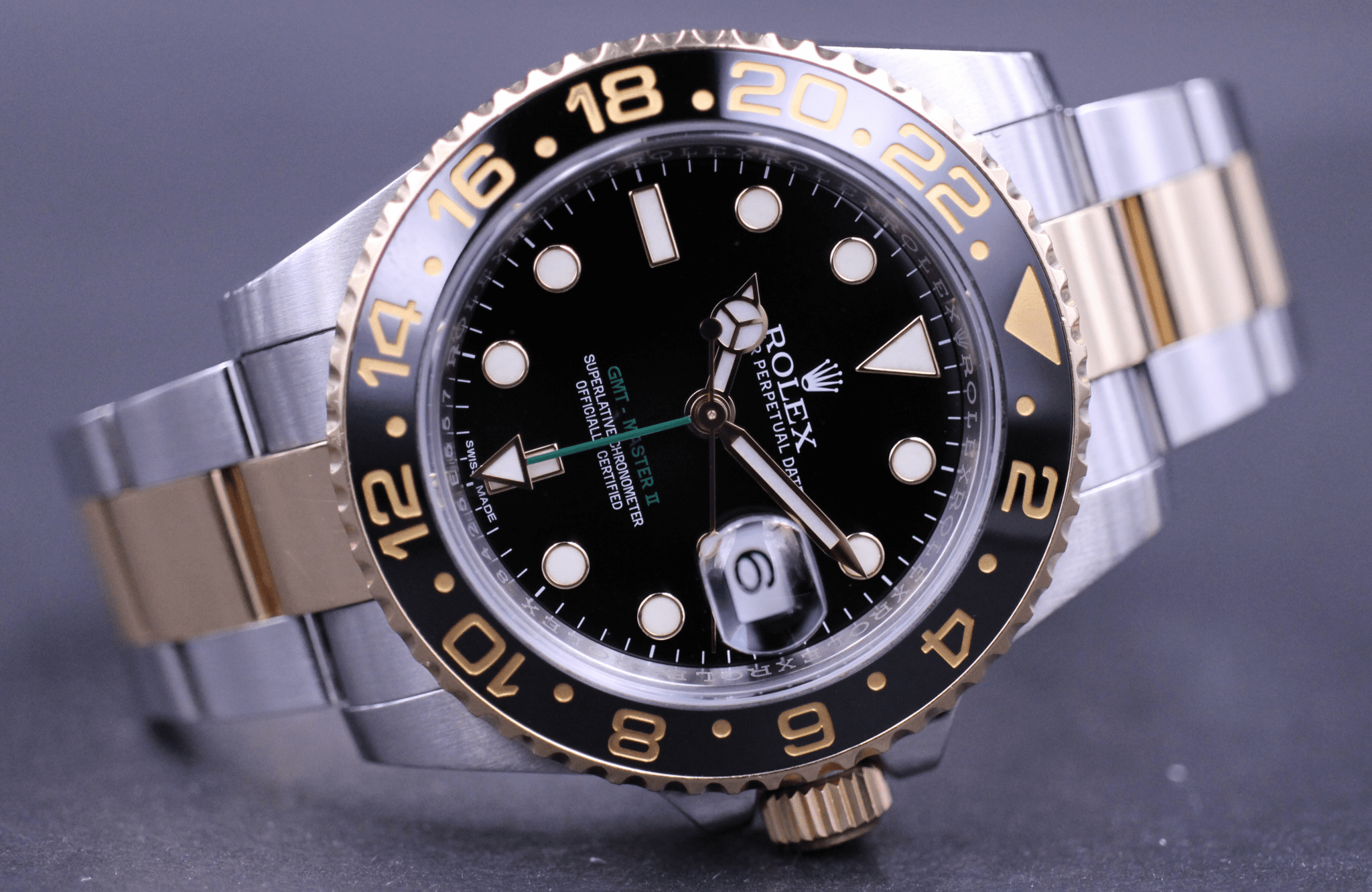 Den nu udgået GMT-Master II i guld&stål med keramisk lynette og maxikasse. Uret måler 40mm, er med automatisk Cal. 3186 værk.