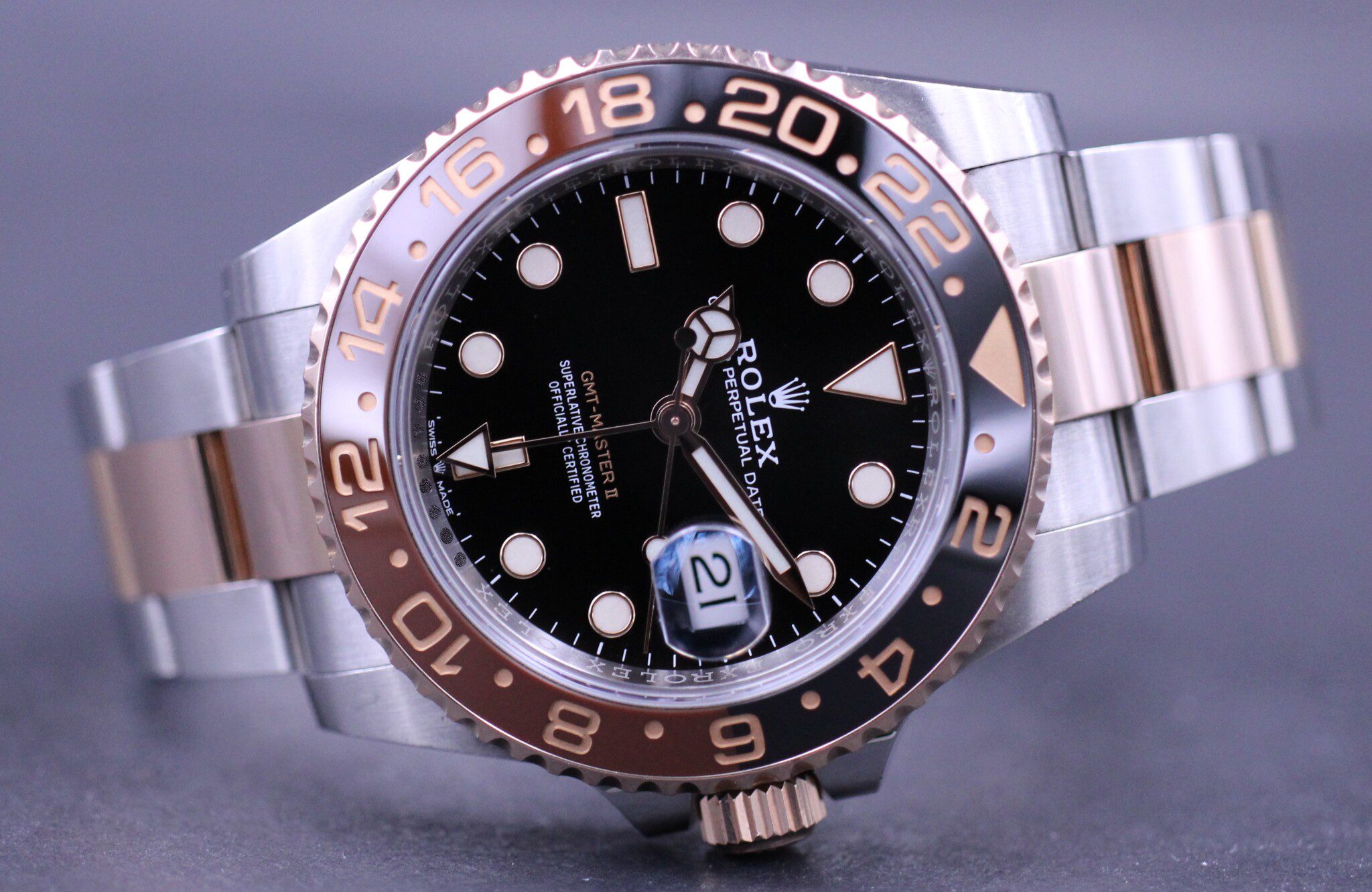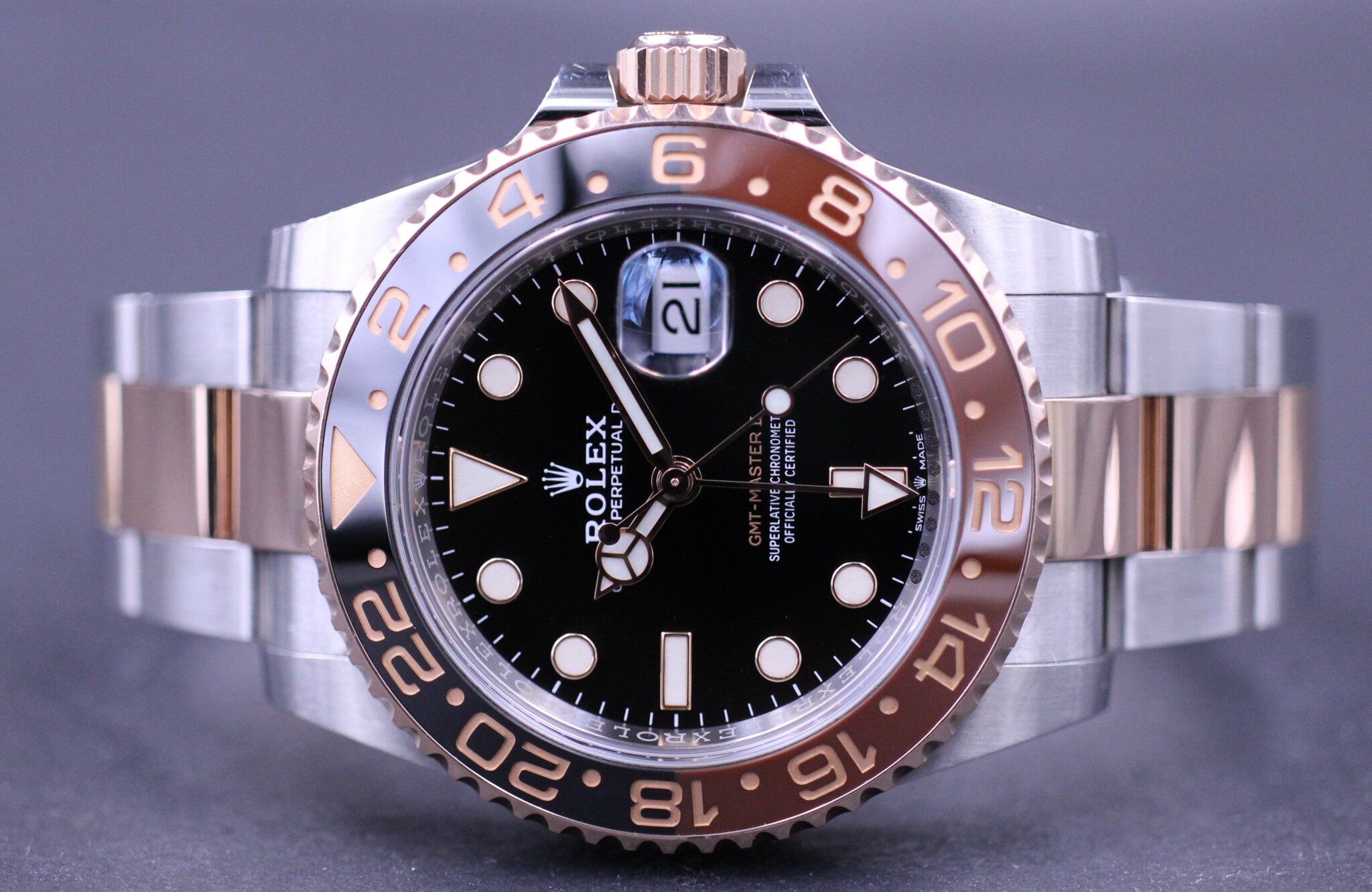 Her det nyeste GMT-Master II i 18kt. Everose guld og stål. Populær model der blev præsenteret til Baselworld 2018.
