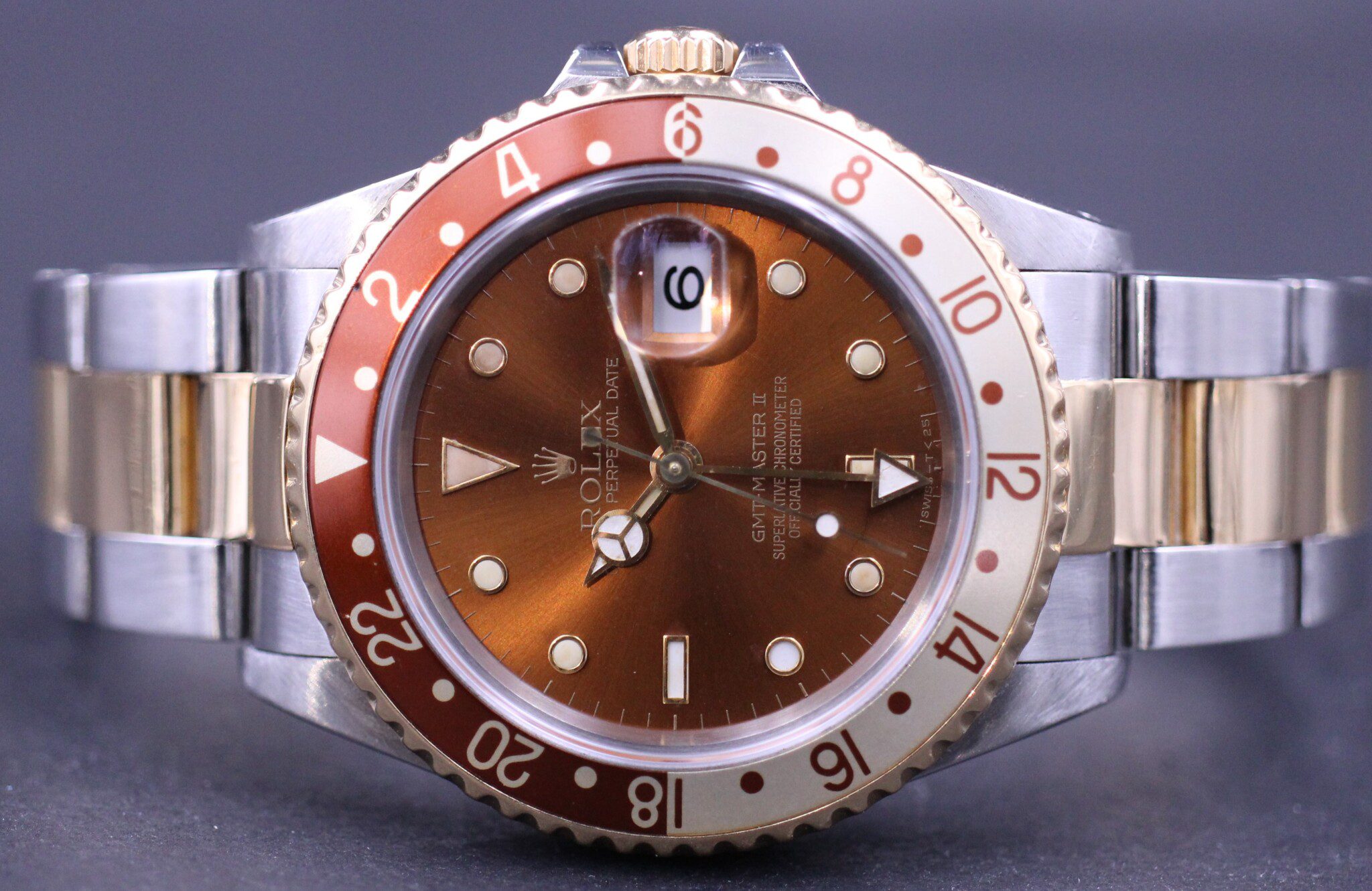Den klassiske Two-Tone GMT-Master II i G/S med brun skive “Tiger Eye” som måler 40mm. Uret er automatisk og har naturligvis GMT- og datofunktion.