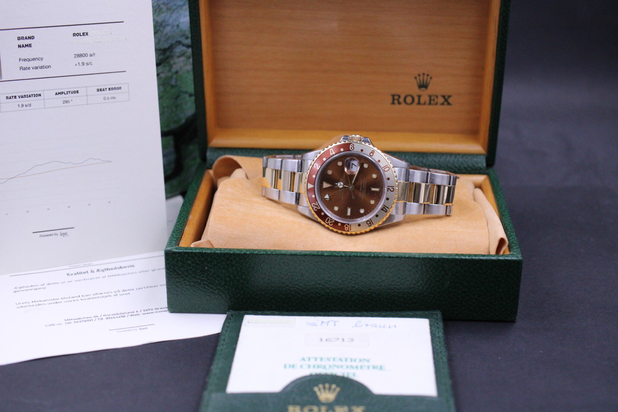 Med til dette ur medfølger MMwatches ”Kvalitet og ægthedsbevis”. Gennem vores grundige gennemgang af uret, fastslår vi at uret er 100% originalt. Urets mekaniske tilstand er testet og lever op til vores kvalitetskrav. Målingerne kan ses i det medfølgende bevis.