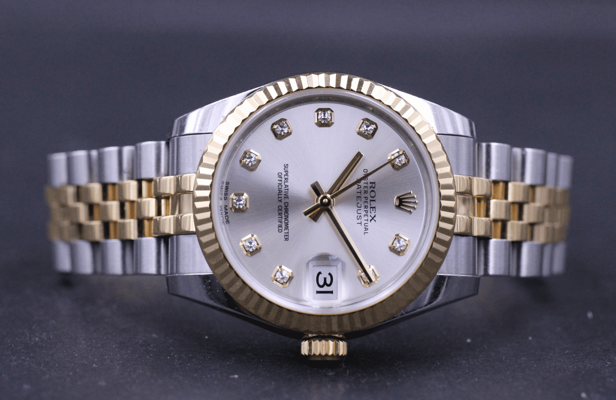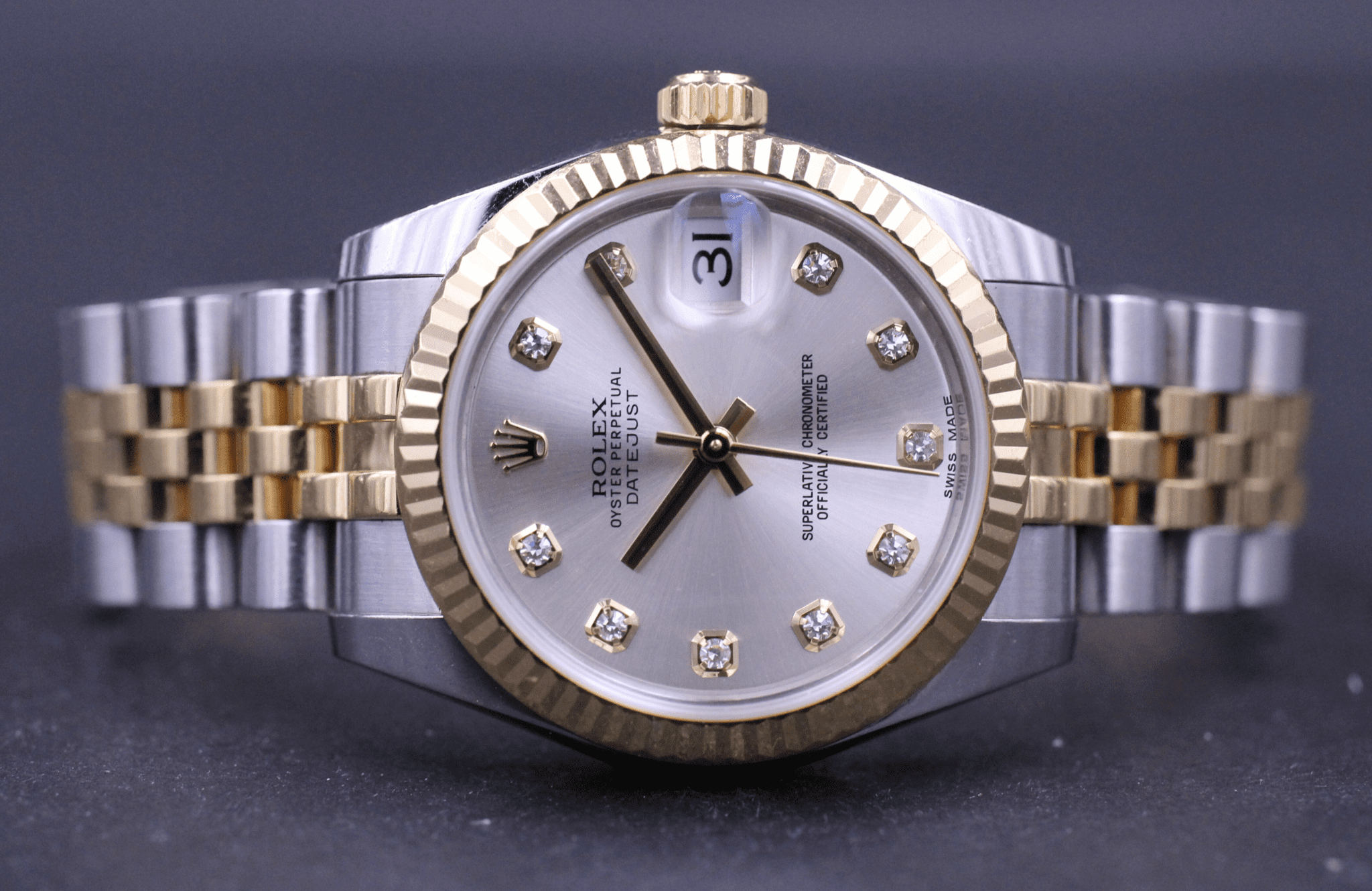 Yderst populær Datejust til kvinder. Uret måler fine 31mm og er her med en flot stilren sunburst silver skive med diamanter.