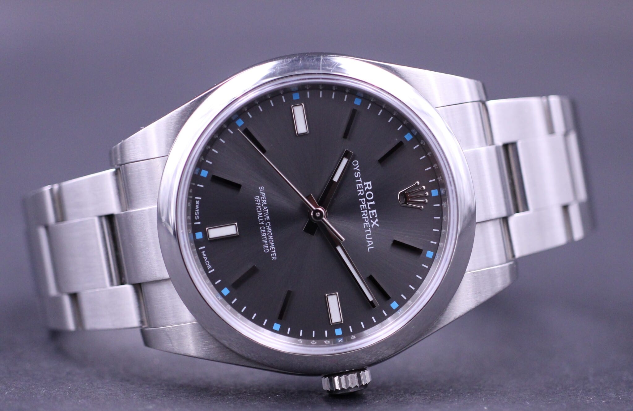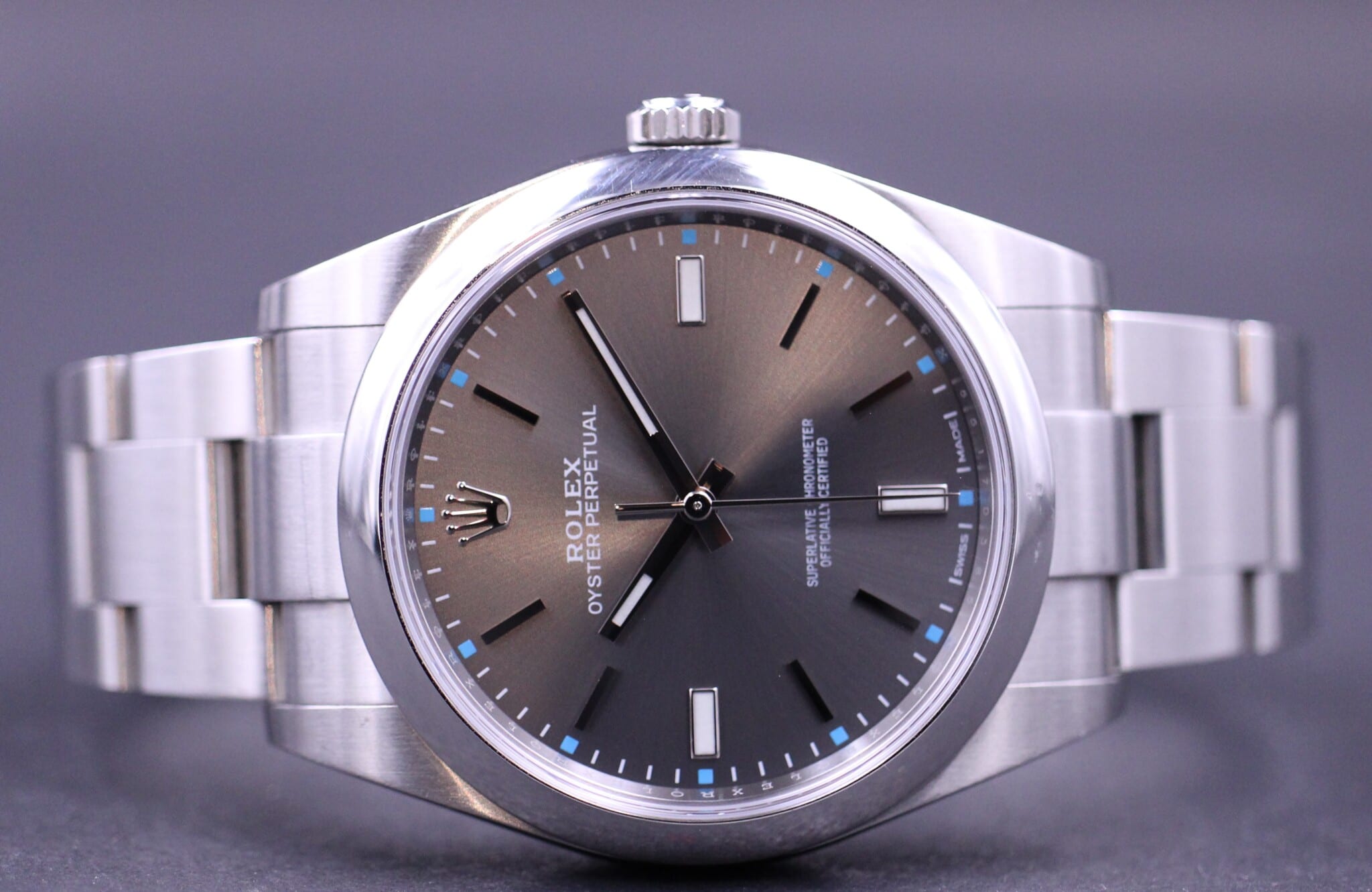 Super flot og klassisk Rolex Oyster Perpetual, her i 39mm. Smuk blå rhodium skive samt smooth bezel.