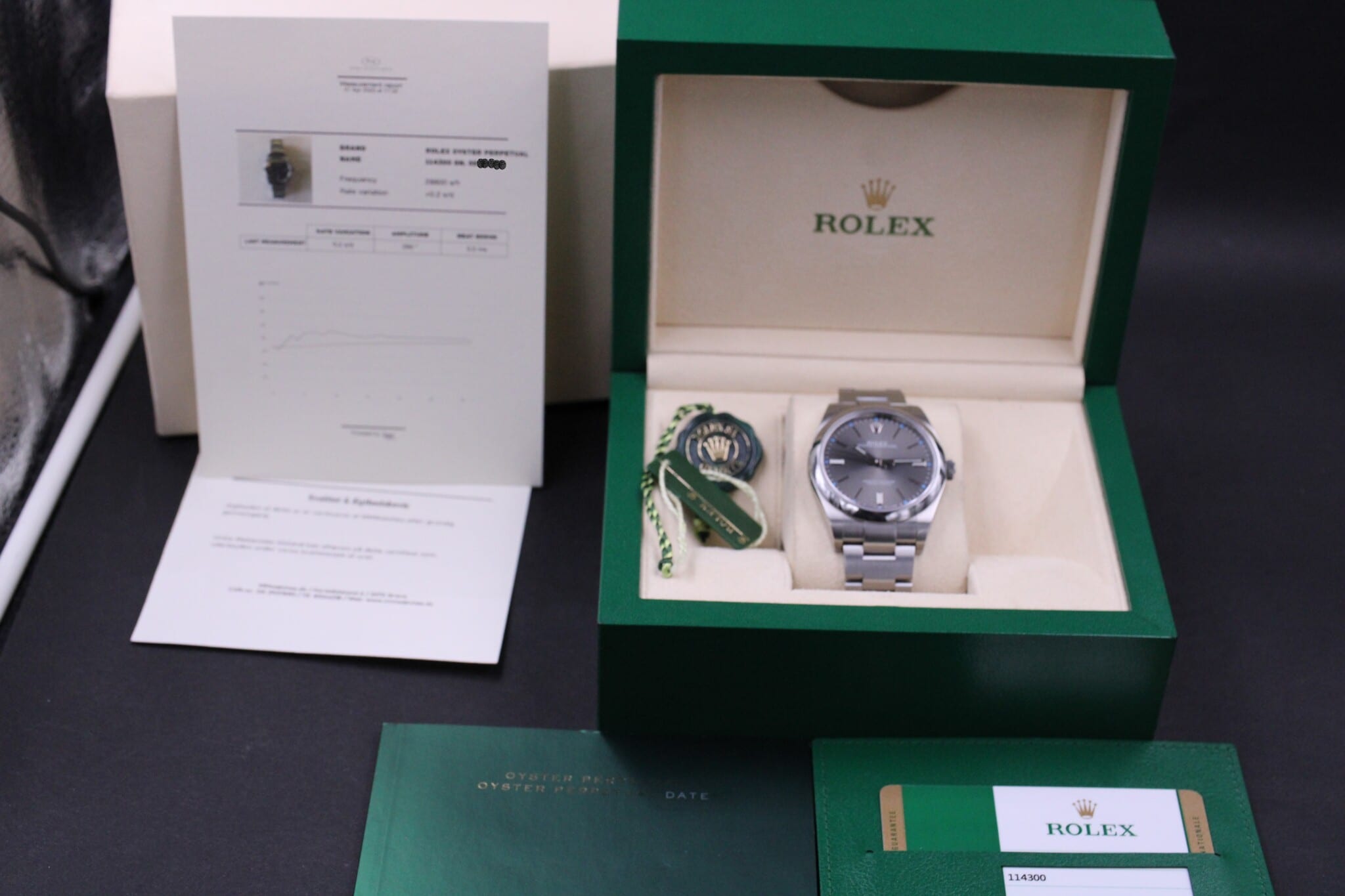 Rolex Oyster Perpetual, ref. 114300 solgt i august 2015. dermed omfattet af Rolex World Wide Garanti til august 2020.