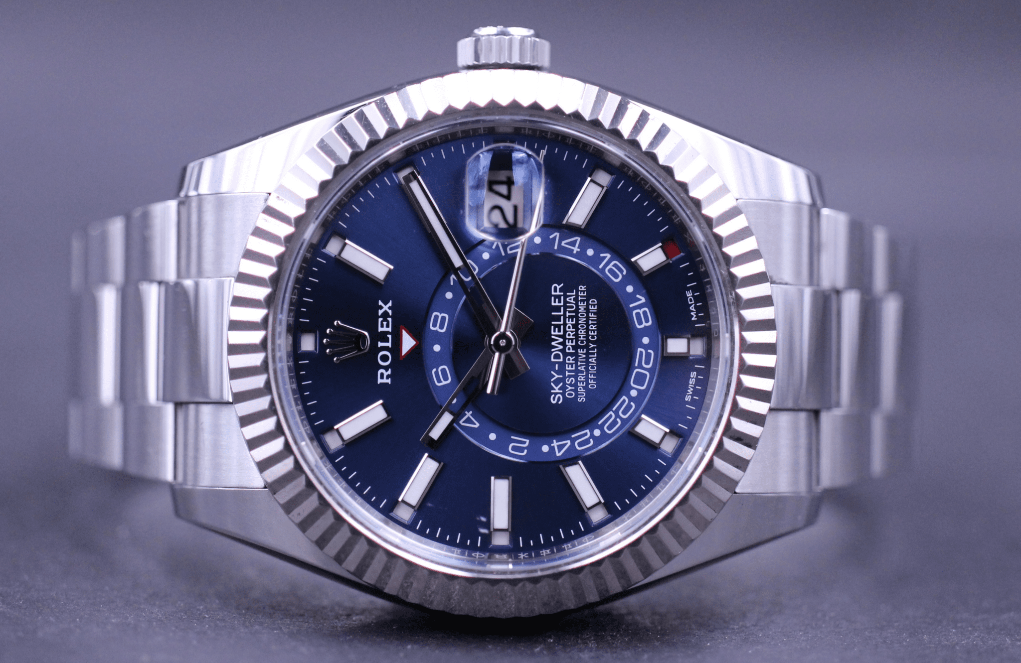 Mærke: Rolex Model: Sky-dweller Ref. nr.: 326934 Årgang: 2021 Tilbehør: Boks, papirer & certifikat Funktioner: Dato, GMT & Annual kalender Størrelse: 42mm Stand: 95%