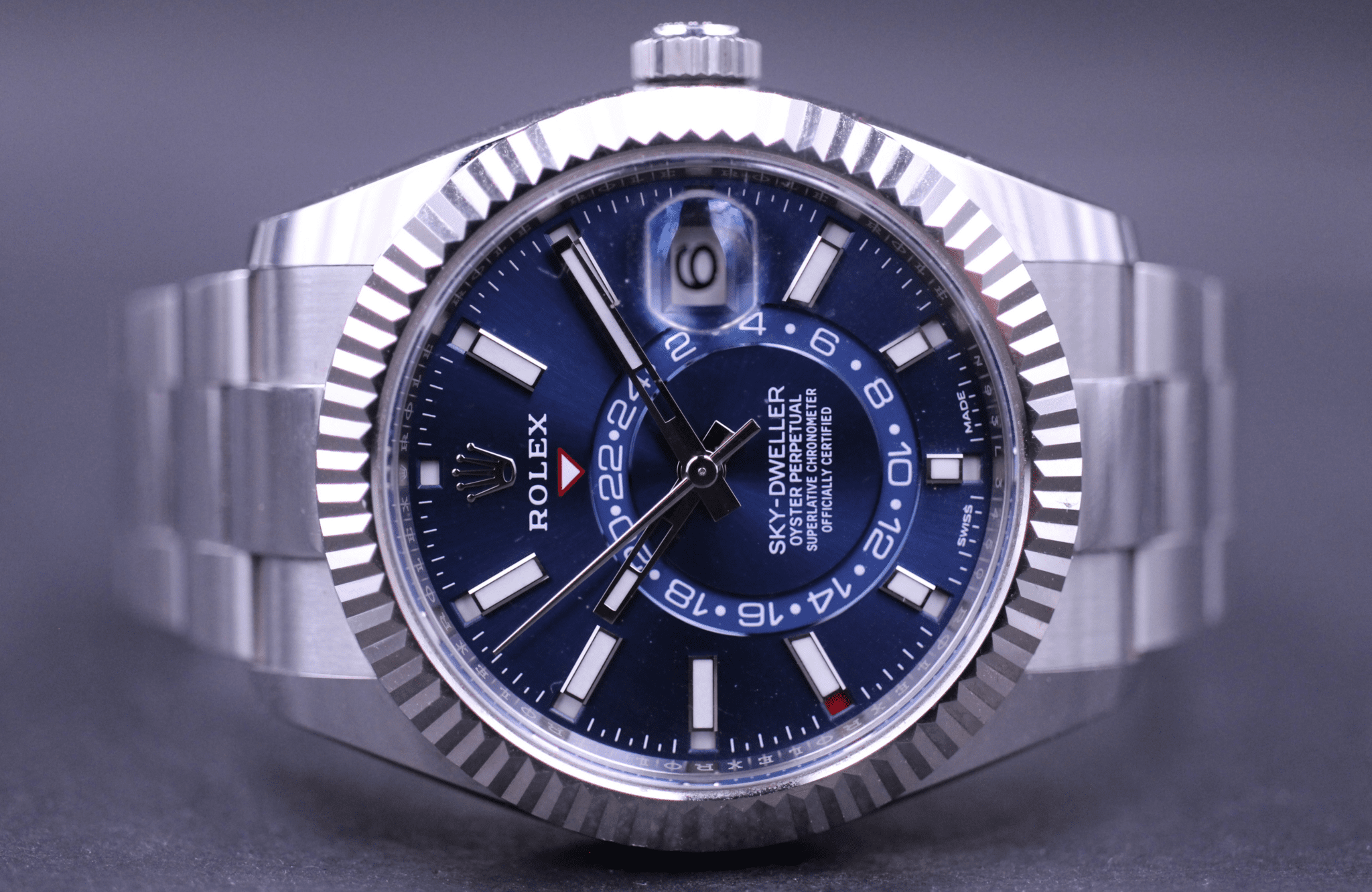 Sky-Dwelleren som blev lanceret i 2012, med teknologi beskytte af intet mindre end 14 patenter, er vel nok Rolex mest teknisk avancerede ur til dato. Urets design er yderst sofistikeret med selve kassen i Rolesor, den flotte blå skive med hvide markeringer og features som bla. aflæsning af to tidszoner på samme tid, månedsangivelse og “annual calender”. Det hele styret af et Cal. 9001 værk.