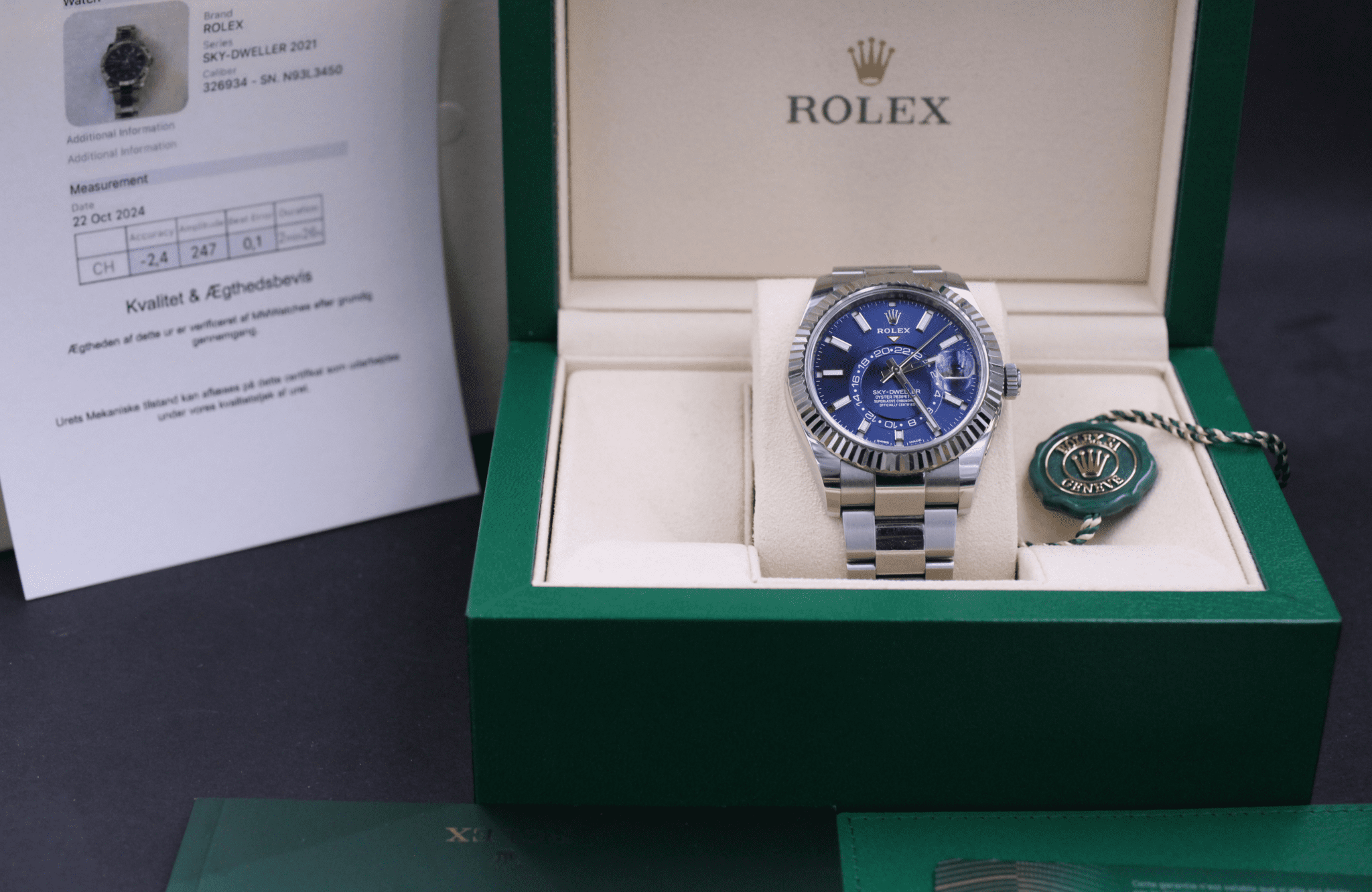 Mærke: Rolex Model: Sky-Dweller Ref. nr.: 326934 Årgang: 2021 Tilbehør: Boks, papirer & certifikat Funktioner: Dato, GMT & Annual kalender Størrelse: 42mm Stand: 95%