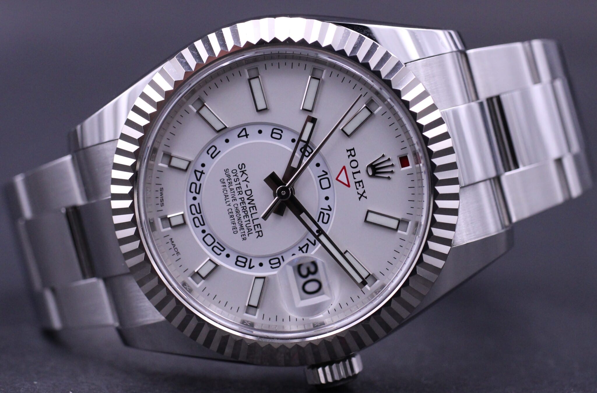 Super flot Sky-Dweller i stål, her med den flotte hvide skive.