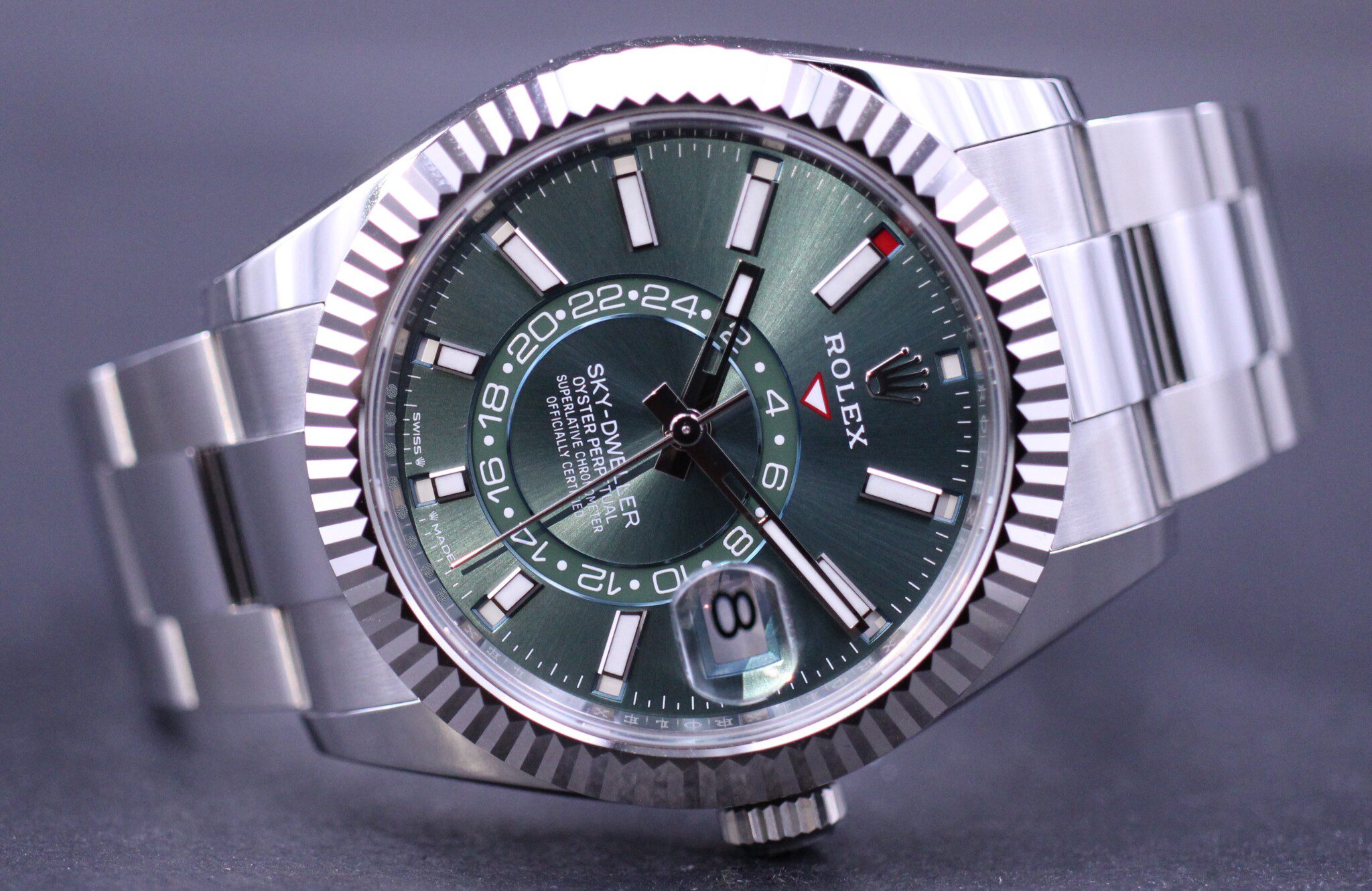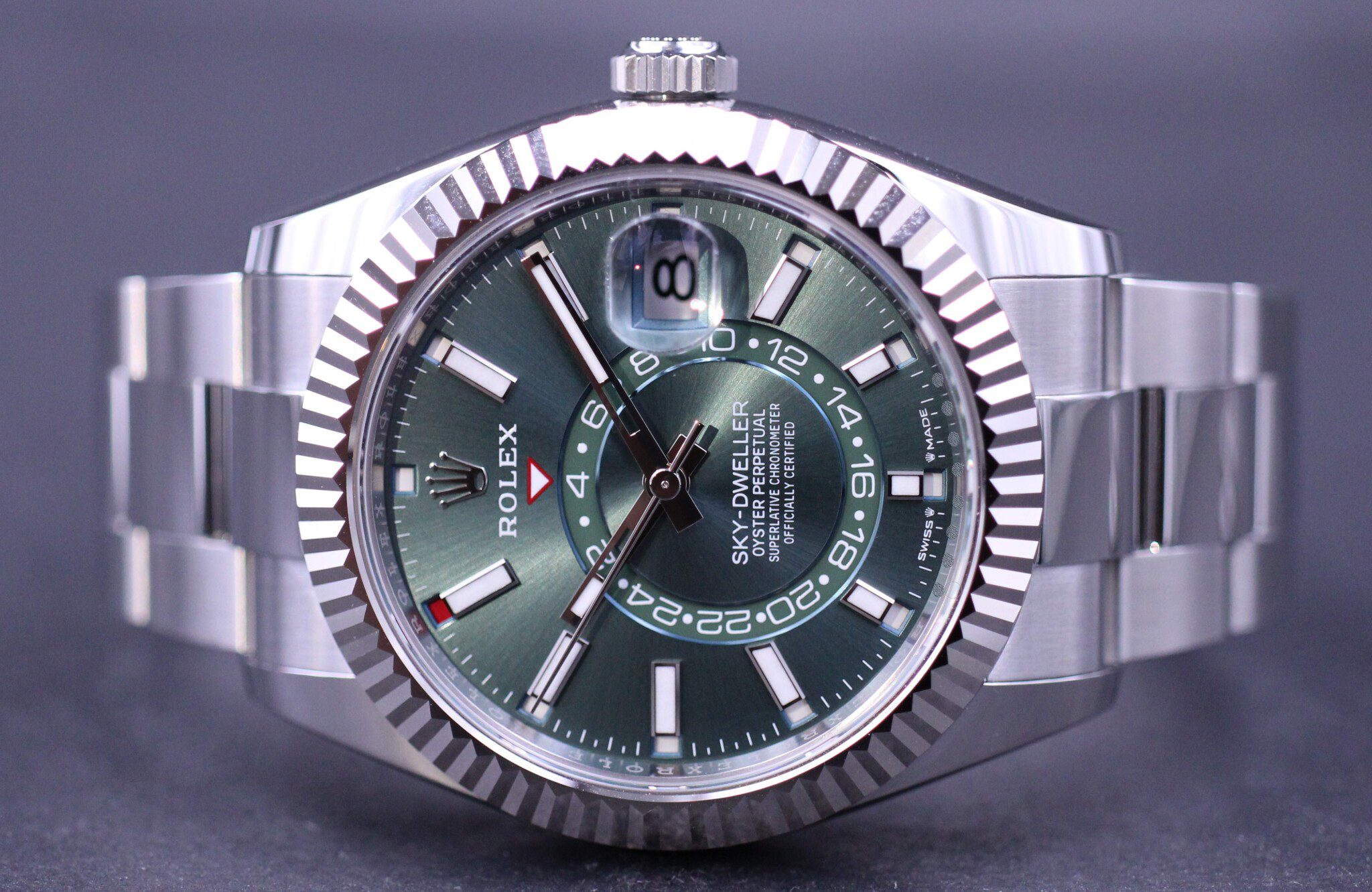 Sky-Dwelleren som blev lanceret i 2012, med teknologi beskytte af intet mindre end 14 patenter, er vel nok Rolex mest teknisk avancerede ur til dato. Urets design er yderst sofistikeret med selve kassen i Rolesor, den flotte grønne skive med hvide markeringer og features som bla. aflæsning af to tidszoner på samme tid, månedsangivelse og “annual calender”.