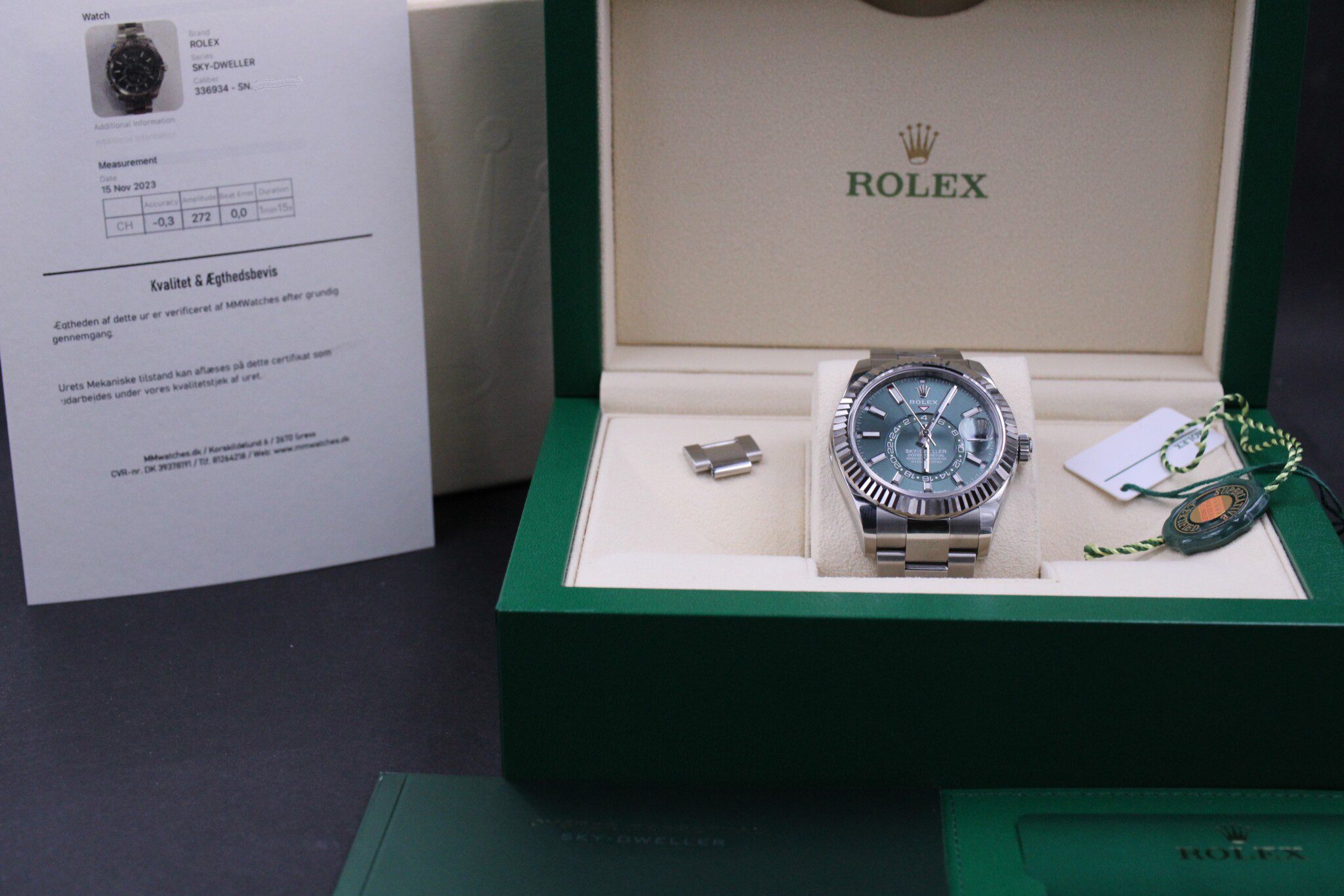 For første gang hos MM Watches præsenteres denne super flotte Sky-Dweller i stål, med den fantastiske grønne skive. Uret her er den opdaterede version af 326934.