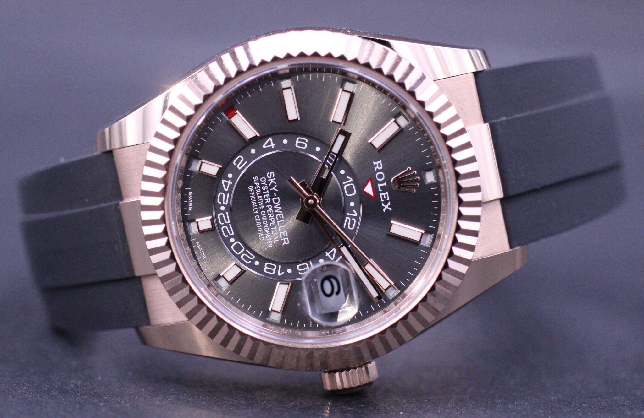 Super flot Sky-Dweller i Rosegold, her med den flotte grå skive og på Oysterflexrem.