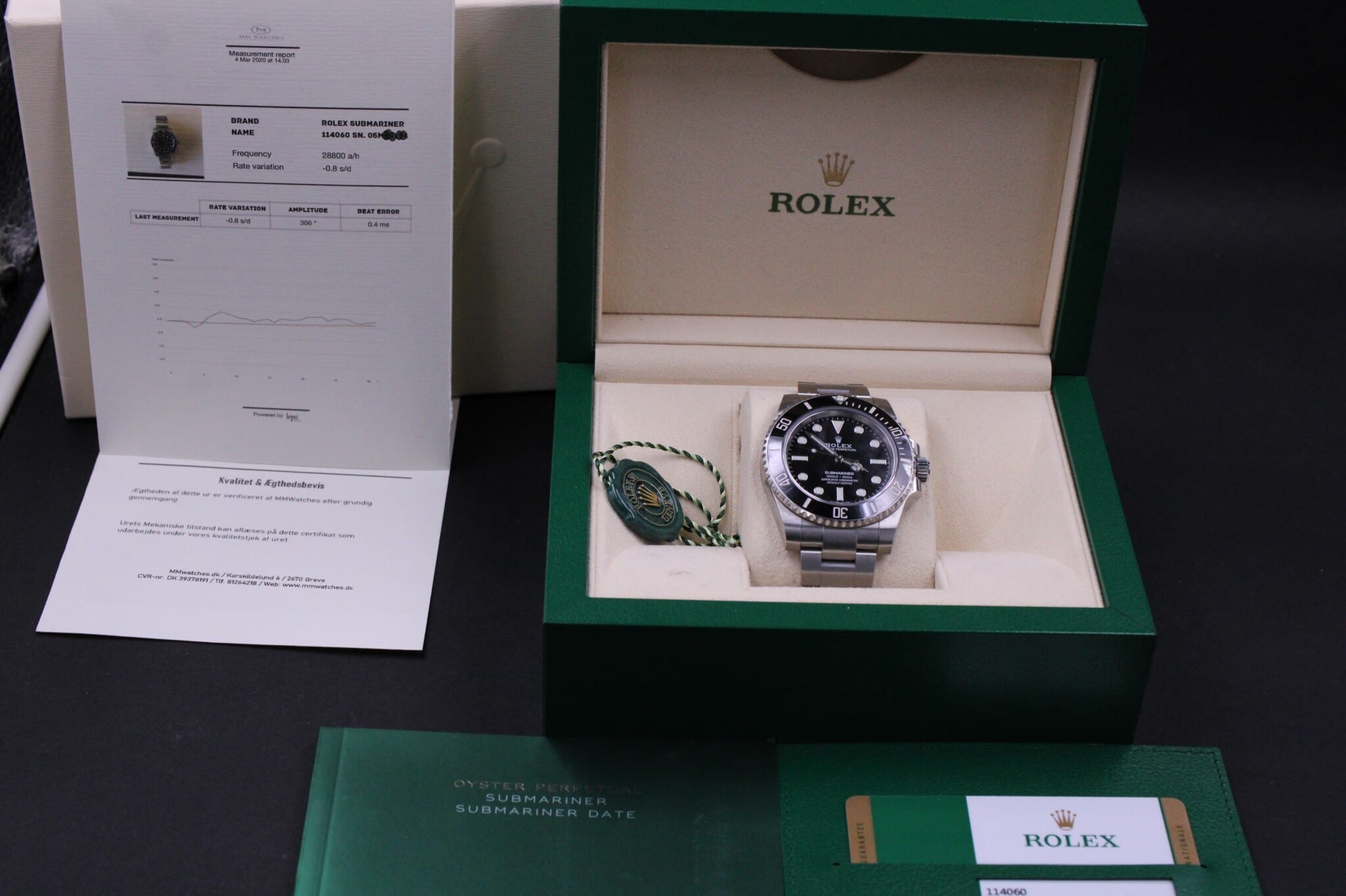 Rolex Submariner, ref. 114060 solgt i 2018 og dermed omfattet af Rolex World Wide Garanti til september 2022.