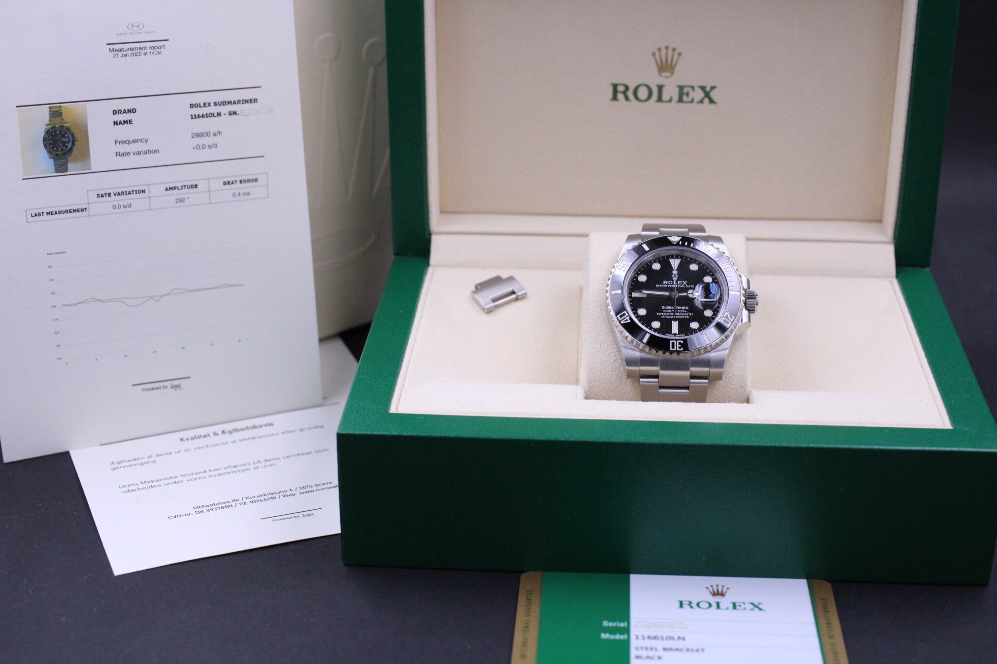 Med til dette ur medfølger MMwatches ”Kvalitet og ægthedsbevis”. Gennem vores grundige gennemgang af uret, fastslår vi at uret er 100% originalt. Urets mekaniske tilstand er testet og lever op til vores kvalitetskrav. Målingerne kan ses i det medfølgende bevis.