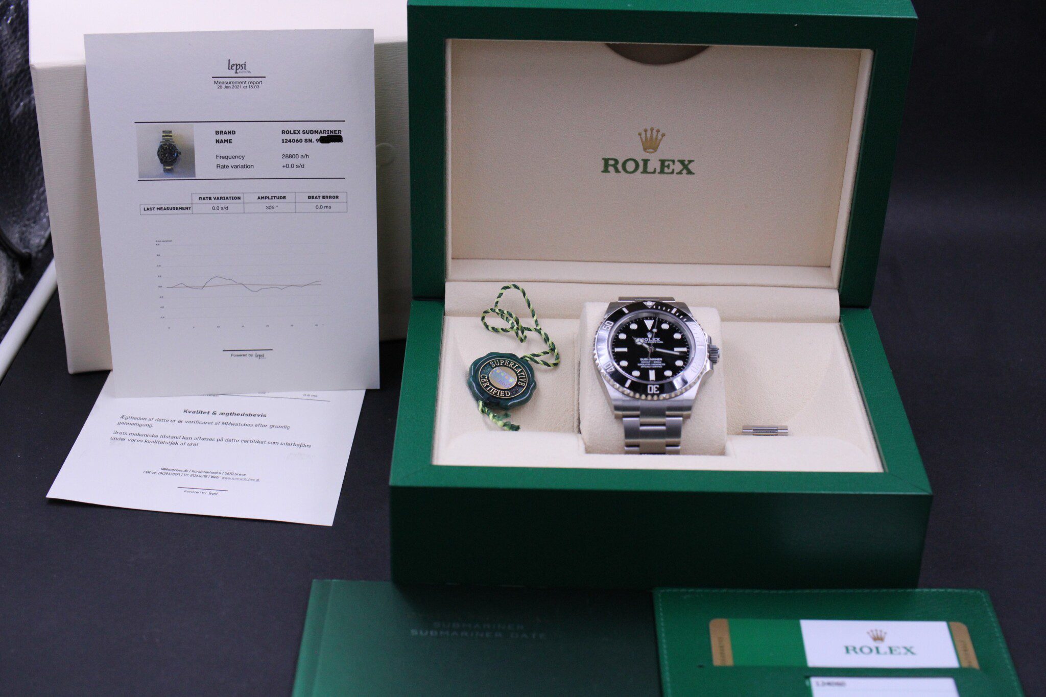 Rolex Submariner, ref 124060 fra Oktober 2020 og omfattet af Rolex World Wide Garanti til 2025. Uret er 100% fabriksnyt, og stadig i folie.