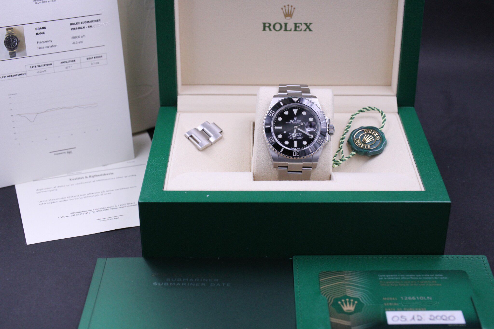 Uret kommer som et komplet sæt med bokse, manualer, certifikat, hangtag, mv.