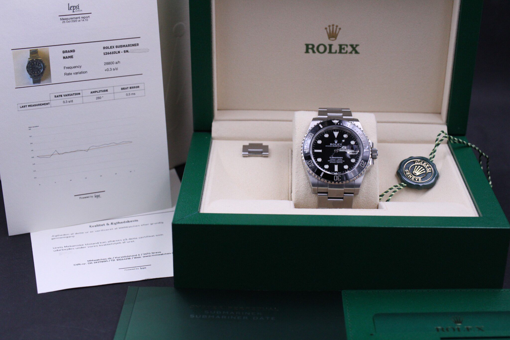 Den nye Rolex Submariner ref. 126610LN. Uret her er fra December 2020, og er dermed omfattet af Rolex World Wide Garanti til udgangen af 2025. Uret er i meget flot stand.