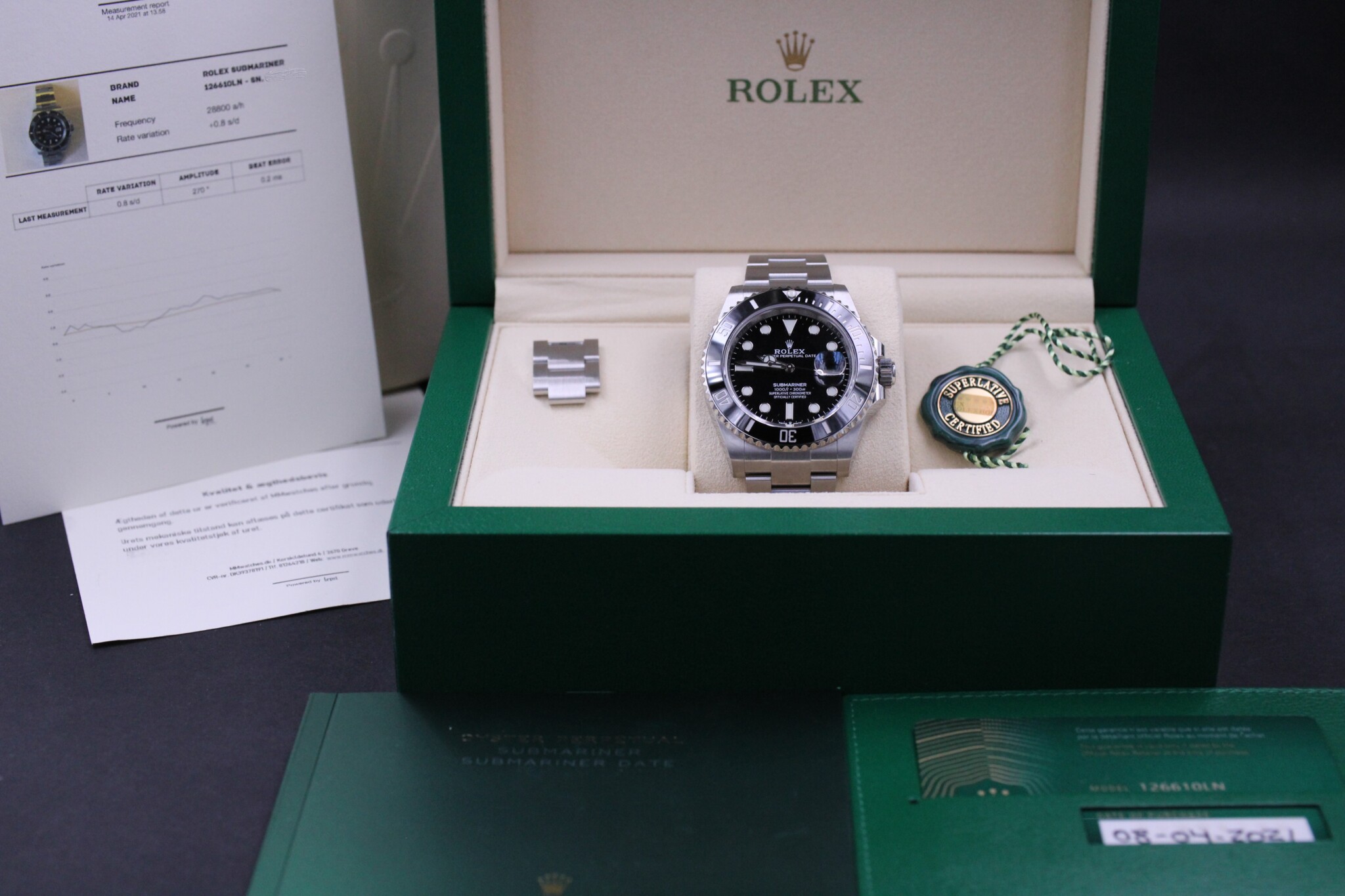 Den helt nye Rolex Submariner ref. 126610LN. Uret her er fra April 2021, og er dermed omfattet af Rolex World Wide Garanti til 2026. Uret er 100% fabriksnyt.
