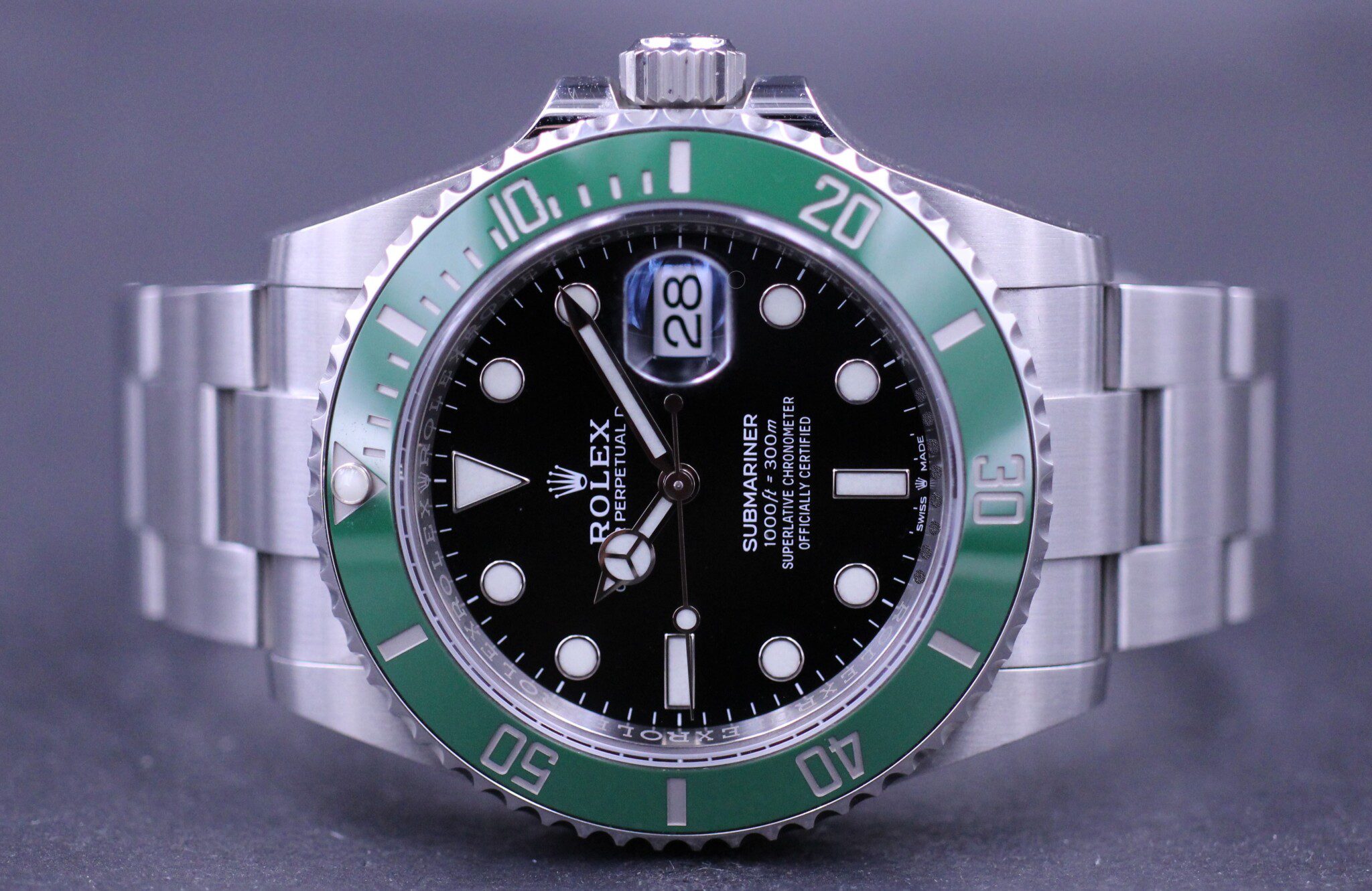 Klassikeren over dem alle – Her i den nyeste udgave med kasse på 41mm, hvidgulds markeringer og visere samt safirglas og grøn keramisk lynette.
