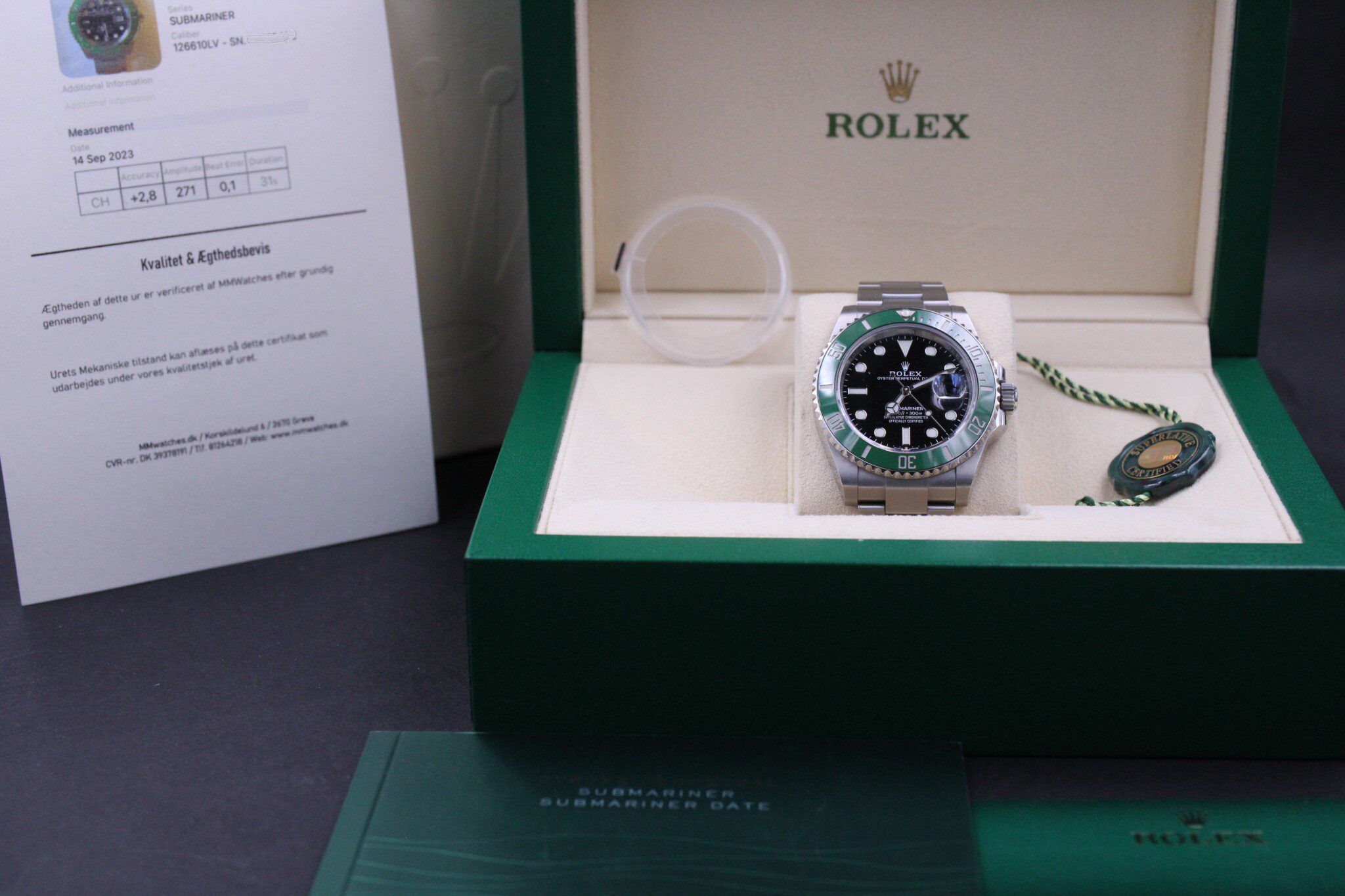Uret kommer som et komplet sæt med bokse, manualer, certifikat, hangtag, bezelbeskytter, mv.