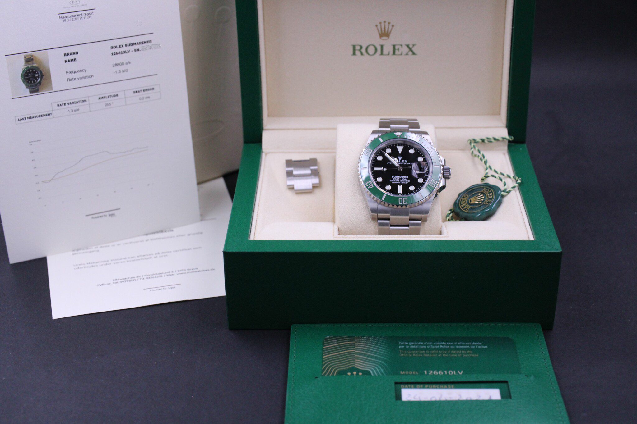 Den helt nye Rolex Submariner ref. 126610LV der blev præsenteret i 2020. Uret her er fra April 2021. Uret er omfattet af Rolex World Wide Garanti til 2026. Uret er i perfekt stand og står stort set som nyt.