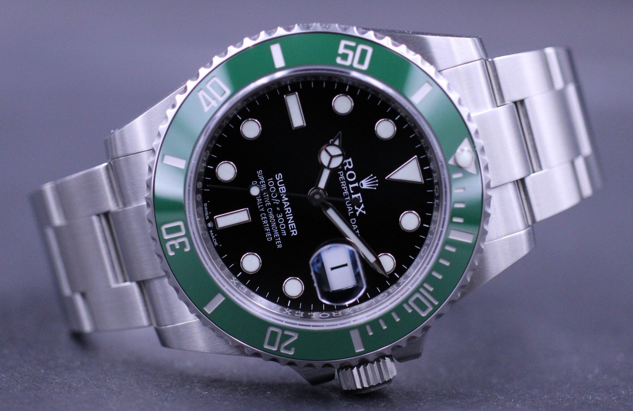 Klassikeren over dem alle – Her i den nyeste udgave med kasse på 41mm, hvidgulds markeringer og visere samt safirglas og grøn keramisk lynette.