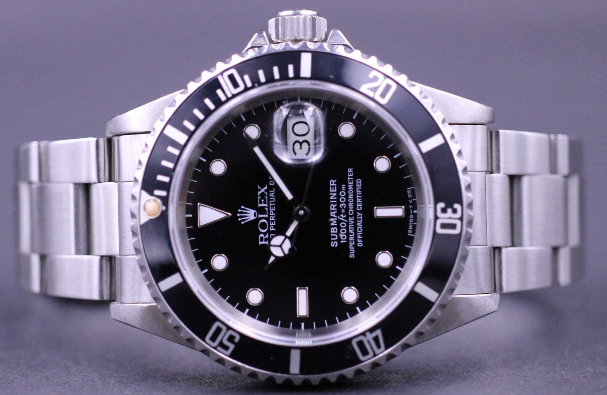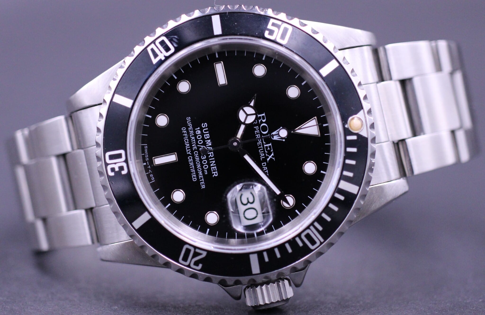 Mærke: Rolex Model: Submariner Ref. nr.: 16610 Årgang: 1994 Tilbehør: boks, papirer og certifikat Funktioner: Dato Størrelse: 40mm Stand: 90%