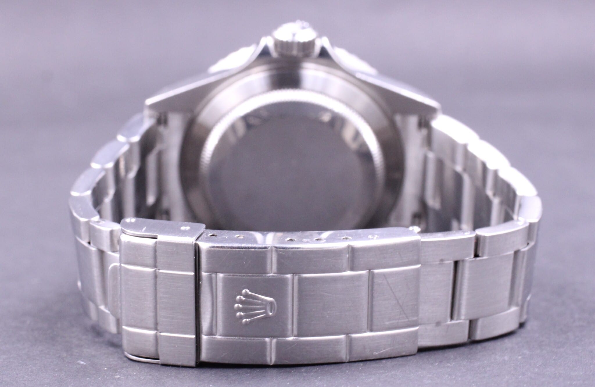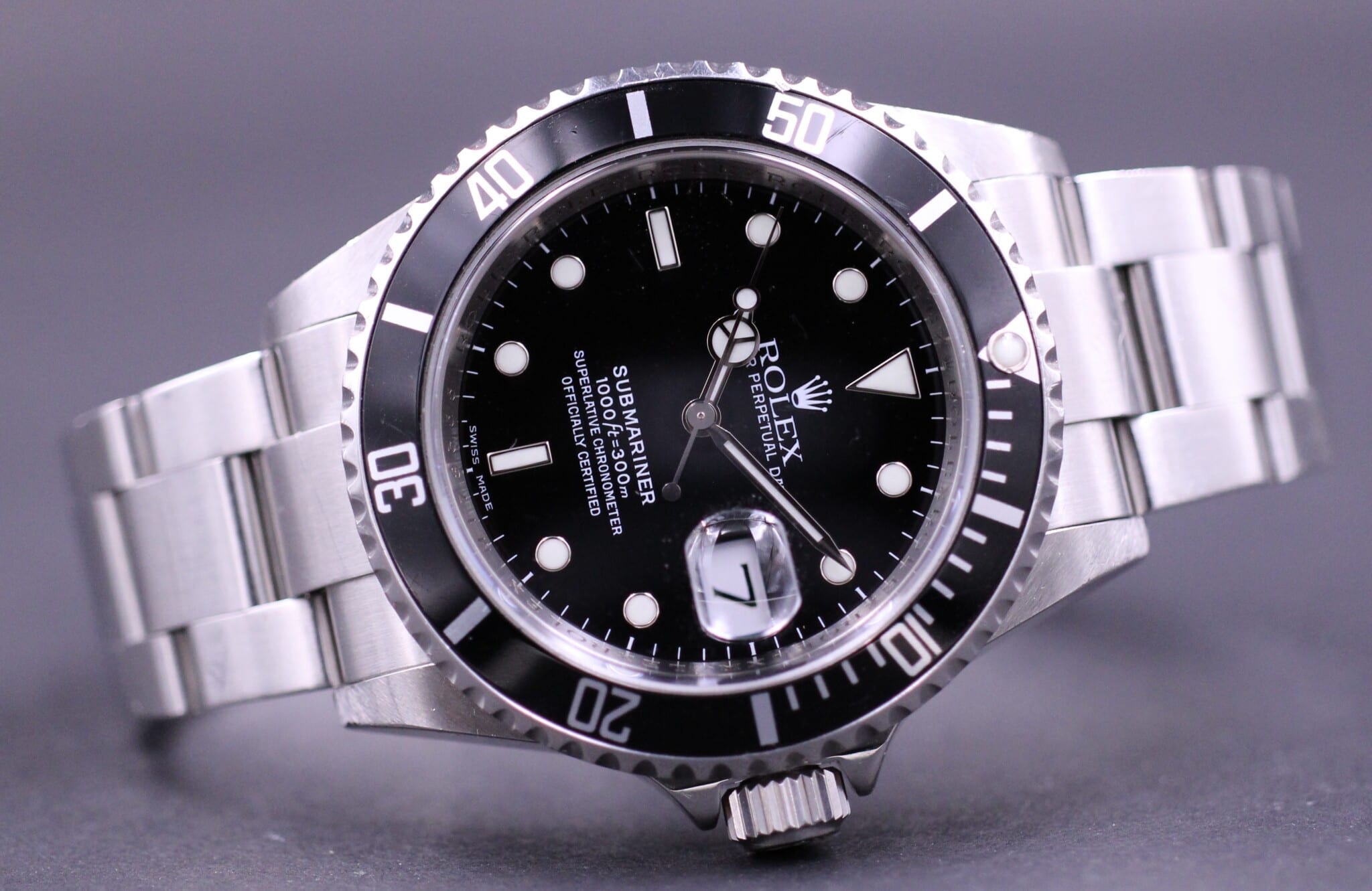 Det super klassiske Submariner, her en af de senere uden lug holes og med ROLEXROLEXROLEX indgraveret i rehaut.