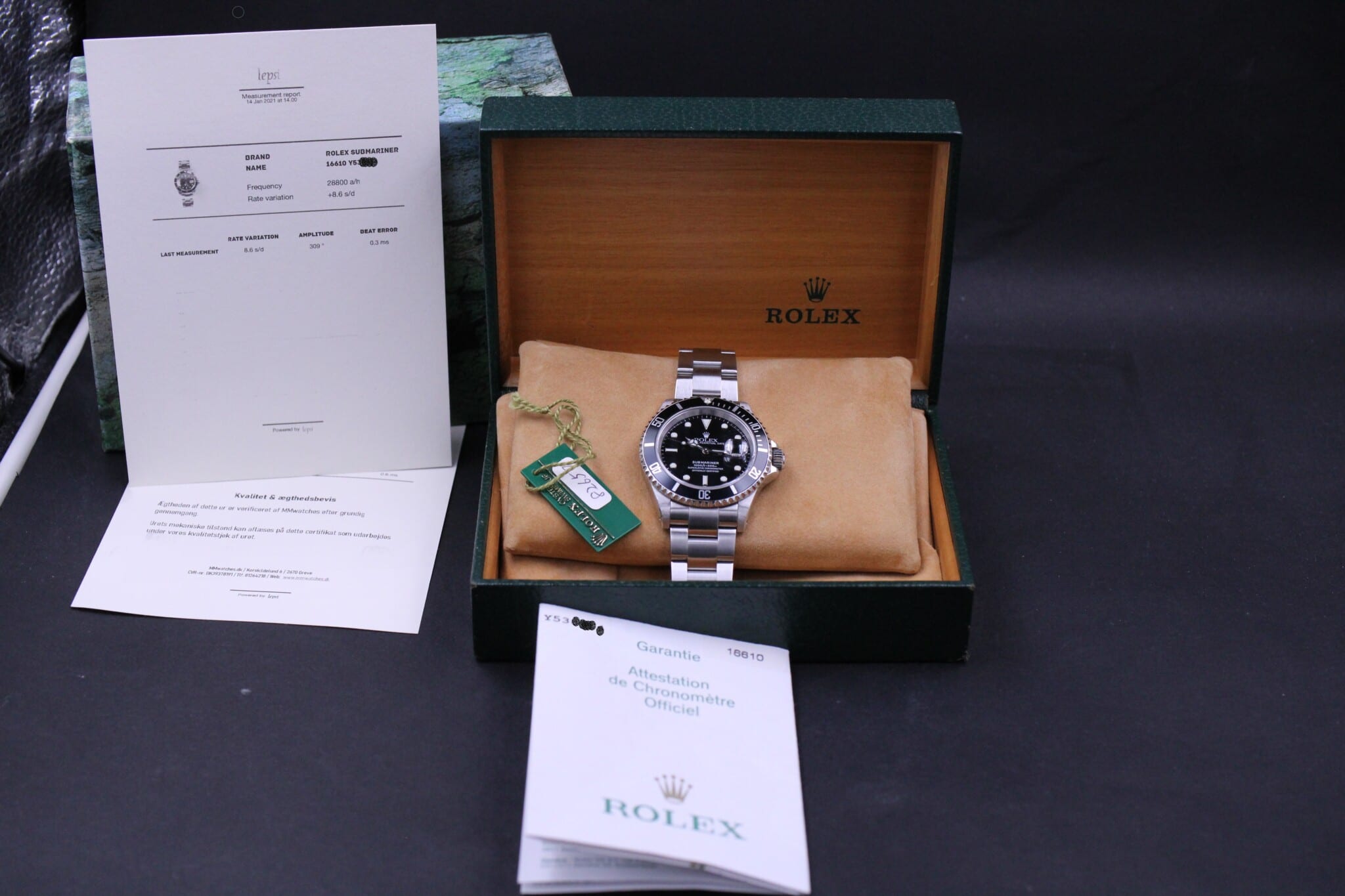 Med til dette ur medfølger MMwatches ”Kvalitet og ægthedsbevis”. Gennem vores grundige gennemgang af uret, fastslår vi at uret er 100% originalt. Urets mekaniske tilstand er testet og lever op til vores kvalitetskrav. Målingerne kan ses i det medfølgende bevis.